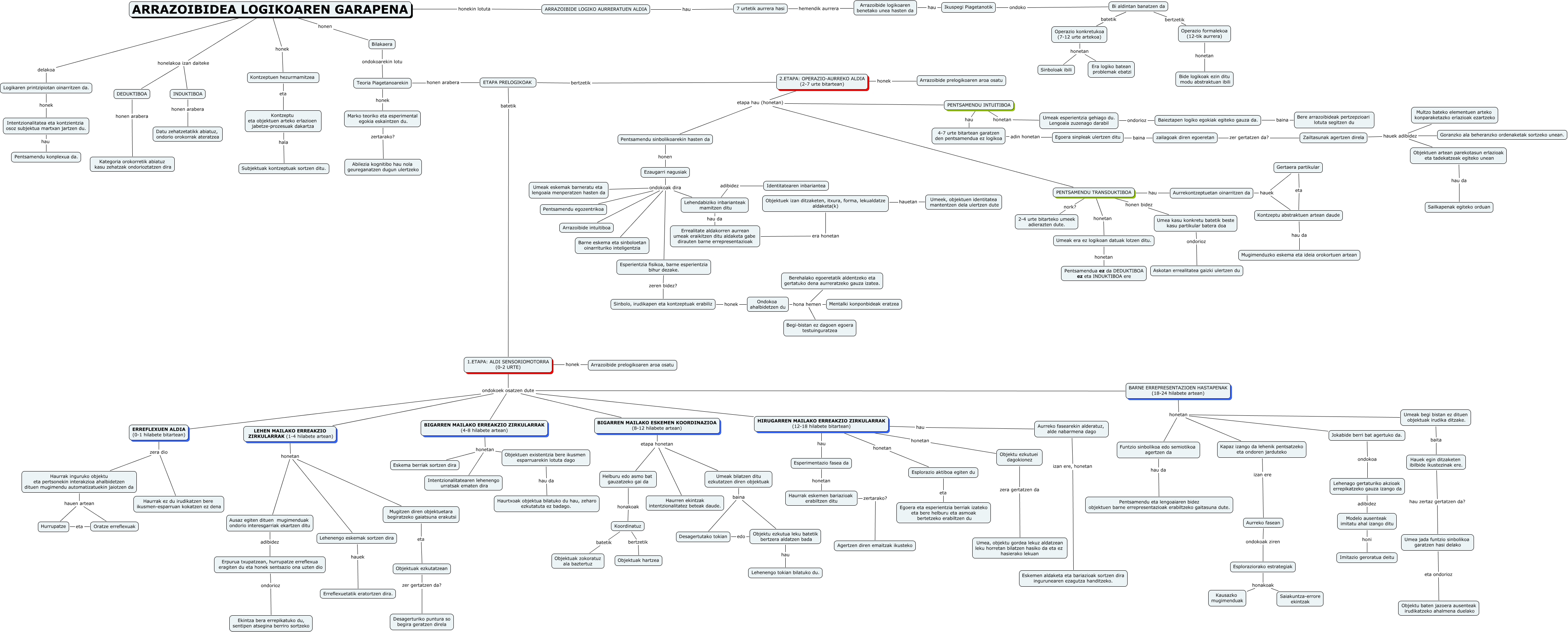 This Concept Map, created with IHMC CmapTools, has information related to: 4_mapa_ortega_arraztoa, Zailtasunak agertzen direla hauek adibidez Multzo bateko elementuen arteko konparaketazko erlazioak ezartzeko, Gertaera partikular eta Kontzeptu abstraktuen artean daude, Aurrekontzeptuetan oinarritzen da hauek Kontzeptu abstraktuen artean daude, BIGARREN MAILAKO ERREAKZIO ZIRKULARRAK (4-8 hilabete artean) honetan Intentzionalitatearen lehenengo urratsak ematen dira, PENTSAMENDU TRANSDUKTIBOA honetan Umeak era ez logikoan datuak lotzen ditu., Umeak bilatzen ditu ezkutatzen diren objektuak baina Objektu ezkutua leku batetik bertzera aldatzen bada, BARNE ERREPRESENTAZIOEN HASTAPENAK (18-24 hilabete artean) honetan Funtzio sinbolikoa edo semiotikoa agertzen da, Intentzionalitatea eta kontzientzia osoz subjektua martxan jartzen du. hau Pentsamendu konplexua da., ARRAZOIBIDEA LOGIKOAREN GARAPENA honelakoa izan daiteke DEDUKTIBOA, Mugitzen diren objektuetara begiratzeko gaiatsuna erakutsi eta Objektuak ezkutatzean, Egoera sinpleak ulertzen ditu baina zailagoak diren egoeretan, 1.ETAPA: ALDI SENSORIOMOTORRA (0-2 URTE) honek Arrazoibide prelogikoaren aroa osatu, 4-7 urte bitartean garatzen den pentsamendua ez logikoa adin honetan Egoera sinpleak ulertzen ditu, Umea jada funtzio sinbolikoa garatzen hasi delako eta ondorioz Objektu baten jazoera ausenteak irudikatzeko ahalmena duelako, LEHEN MAILAKO ERREAKZIO ZIRKULARRAK (1-4 hilabete artean) honetan Lehenengo eskemak sortzen dira, Ezaugarri nagusiak ondokoak dira Barne eskema eta sinboloetan oinarrituriko inteligentzia, Arrazoibide logikoaren benetako unea hasten da hau Ikuspegi Piagetanotik, 1.ETAPA: ALDI SENSORIOMOTORRA (0-2 URTE) ondokoek osatzen dute BIGARREN MAILAKO ESKEMEN KOORDINAZIOA (8-12 hilabete artean), Zailtasunak agertzen direla hauek adibidez Objektuen artean parekotasun erlazioak eta tadekatzeak egiteko unean, Objektu ezkutua leku batetik bertzera aldatzen bada hau Lehenengo tokian bilatuko du.
