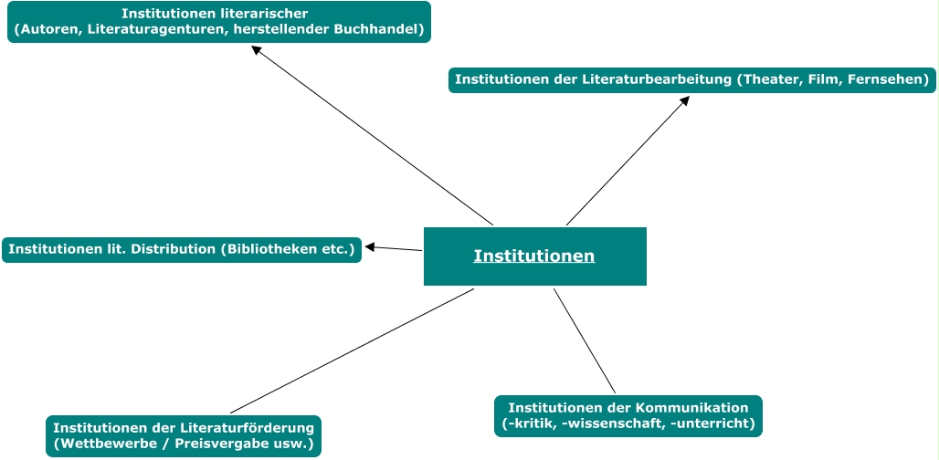 This Concept Map, created with IHMC CmapTools, has information related to: Institutionen, Institutionen Institutionen der Literaturbearbeitung (Theater, Film, Fernsehen), Institutionen Institutionen lit. Distribution (Bibliotheken etc.), Institutionen Institutionen literarischer (Autoren, Literaturagenturen, herstellender Buchhandel), Institutionen Institutionen der Kommunikation (-kritik, -wissenschaft, -unterricht), Institutionen Institutionen der Literaturförderung (Wettbewerbe / Preisvergabe usw.)