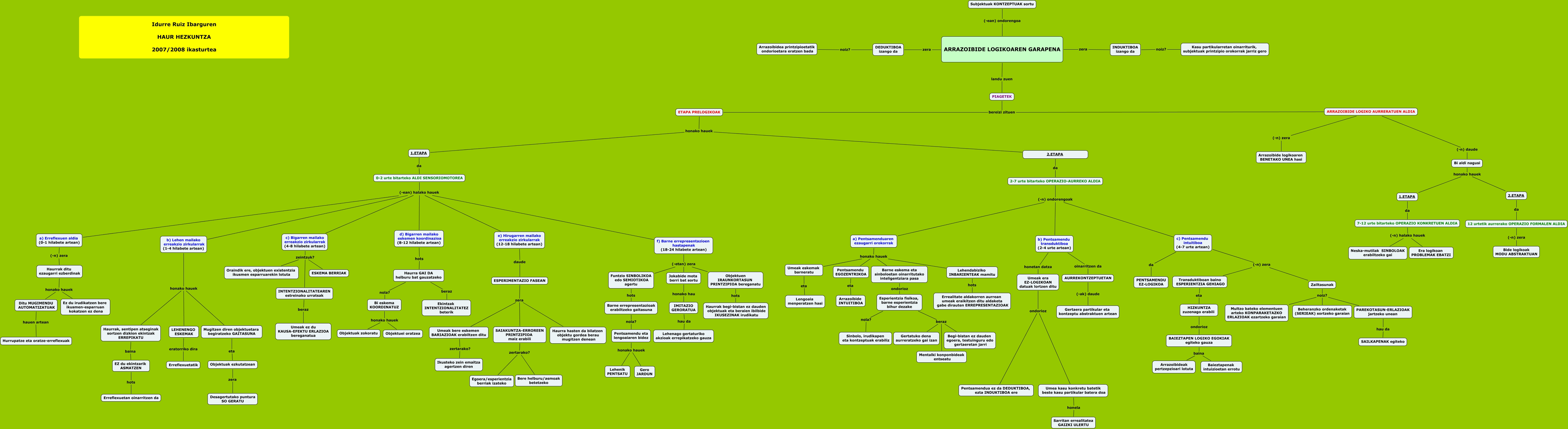 This Concept Map, created with IHMC CmapTools, has information related to: 4_mapa_ruiz_ibarguren, Haurrak ditu ezaugarri ezberdinak honako hauek Ez du irudikatzen bere ikusmen-esparruan kokatzen ez dena, c) Bigarren mailako erreakzio zirkularrak (4-8 hilabete artean) zeintzuk? ESKEMA BERRIAK, Esperientzia fisikoa, barne esperientzia bihur dezake beraz Gertatuko dena aurreratzeko gai izan, ARRAZOIBIDE LOGIKOAREN GARAPENA zera INDUKTIBOA izango da, ARRAZOIBIDE LOGIKOAREN GARAPENA zera DEDUKTIBOA izango da, Mugitzen diren objektuetara begiratzeko GAITASUNA eta Objektuak ezkutatzean, 0-2 urte bitarteko ALDI SENSORIOMOTOREA (-ean) halako hauek f) Barne errepresentazioen hastapenak (18-24 hilabete artean), Objektuak ezkutatzean zera Desagertutako puntura SO GERATU, Pentsamendu EGOZENTRIKOA eta Arrazoibide INTUITIBOA, c) Bigarren mailako erreakzio zirkularrak (4-8 hilabete artean) zeintzuk? INTENTZIONALITATEAREN estreinako urratsak, 0-2 urte bitarteko ALDI SENSORIOMOTOREA (-ean) halako hauek d) Bigarren mailako eskemen koordinazioa (8-12 hilabete artean), a) Pentsamenduaren ezaugarri orokorrak honako hauek Barne eskema eta sinboloetan oinarritutako inteligentziara pasa, b) Lehen mailako erreakzio zirkularrak (1-4 hilabete artean) honako hauek Haurrak, sentipen atseginak sortzen dizkion ekintzak ERREPIKATU, Zailtasunak noiz? PAREKOTASUN-ERLAZIOAK jartzeko unean, ETAPA PRELOGIKOAK honako hauek 1.ETAPA, ARRAZOIBIDE LOGIKO AURRERATUEN ALDIA (-n) daude Bi aldi nagusi, a) Pentsamenduaren ezaugarri orokorrak honako hauek Pentsamendu EGOZENTRIKOA, SAIAKUNTZA-ERROREEN PRINTZIPIOA maiz erabili zertarako? Bere helburu/asmoak betetzeko, b) Pentsamendu transduktiboa (2-4 urte artean) oinarritzen da AURREKONTZEPTUETAN, 1.ETAPA da 0-2 urte bitarteko ALDI SENSORIOMOTOREA
