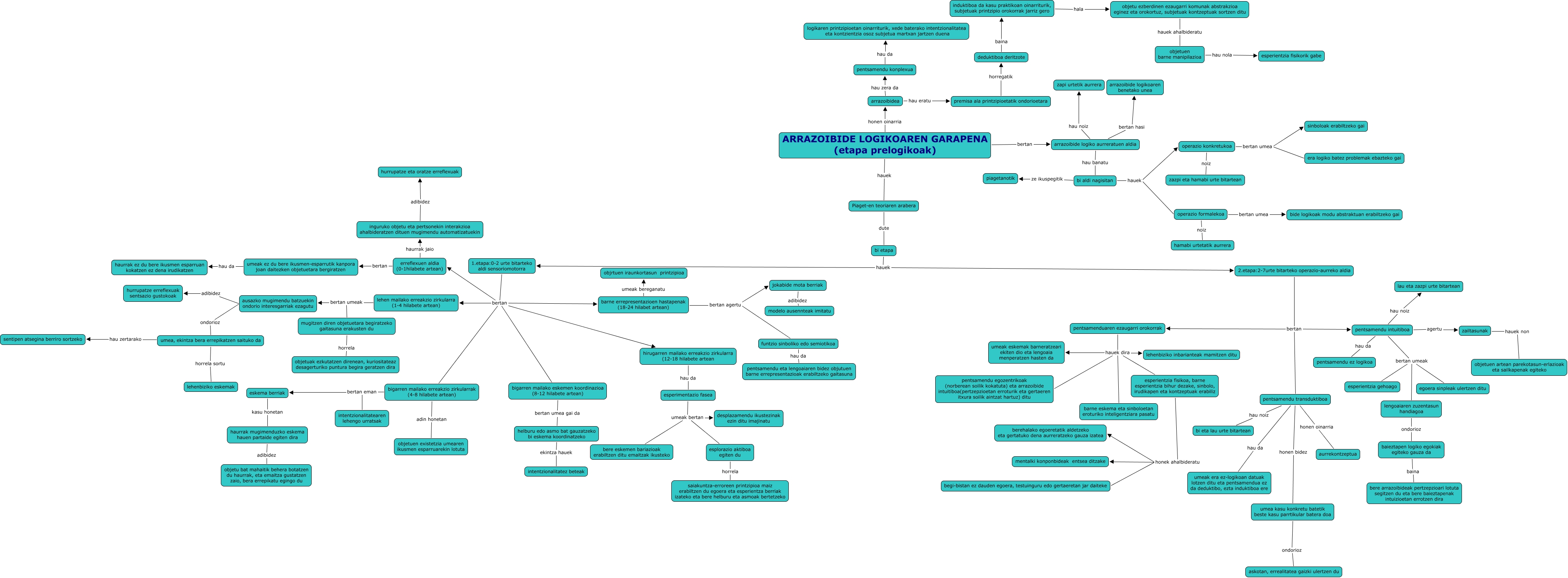 This Concept Map, created with IHMC CmapTools, has information related to: 4_mapa_Errasti_Larrañaga, bi aldi nagisitan ze ikuspegitik piagetanotik, objetuen barne manipilazioa hau nola esperientzia fisikorik gabe, 1.etapa:0-2 urte bitarteko aldi sensoriomotorra bertan bigarren mailako erreakzio zirkularrak (4-8 hilabete artean), bigarren mailako eskemen koordinazioa (8-12 hilabete artean) bertan umea gai da helburu edo asmo bat gauzatzeko bi eskema koordinatzeko, ARRAZOIBIDE LOGIKOAREN GARAPENA (etapa prelogikoak) hauek Piaget-en teoriaren arabera, erreflexuen aldia (0-1hilabete artean) bertan umeak ez du bere ikusmen-esparrutik kanpora joan daitezken objetuetara bergiratzen, pentsamendu transduktiboa honen oinarria aurrekontzeptua, barne errepresentazioen hastapenak (18-24 hilabet artean) bertan agertu jokabide mota berriak, bigarren mailako erreakzio zirkularrak (4-8 hilabete artean) bertan eman eskema berriak, zailtasunak hauek non objetuen artean parekotasun-erlazioak eta sailkapenak egiteko, arrazoibide logiko aurreratuen aldia hau noiz zapi urtetik aurrera, ausazko mugimendu batzuekin ondorio interesgarriak ezagutu adibidez hurrupatze erreflexuak sentsazio gustokoak, objetu ezberdinen ezaugarri komunak abstrakzioa eginez eta orokortuz, subjetuak kontzeptuak sortzen ditu hauek ahalbideratu objetuen barne manipilazioa, eskema berriak kasu honetan haurrak mugimenduzko eskema hauen partaide egiten dira, umea, ekintza bera errepikatzen saituko da horrela sortu lehenbiziko eskemak, lengoaiaren zuzentasun handiagoa ondorioz baieztapen logiko egokiak egiteko gauza da, ausazko mugimendu batzuekin ondorio interesgarriak ezagutu ondorioz umea, ekintza bera errepikatzen saituko da, arrazoibide logiko aurreratuen aldia bertan hasi arrazoibide logikoaren benetako unea, jokabide mota berriak adibidez modelo ausennteak imitatu, 1.etapa:0-2 urte bitarteko aldi sensoriomotorra bertan hirugarren mailako erreakzio zirkularra (12-18 hilabete artean