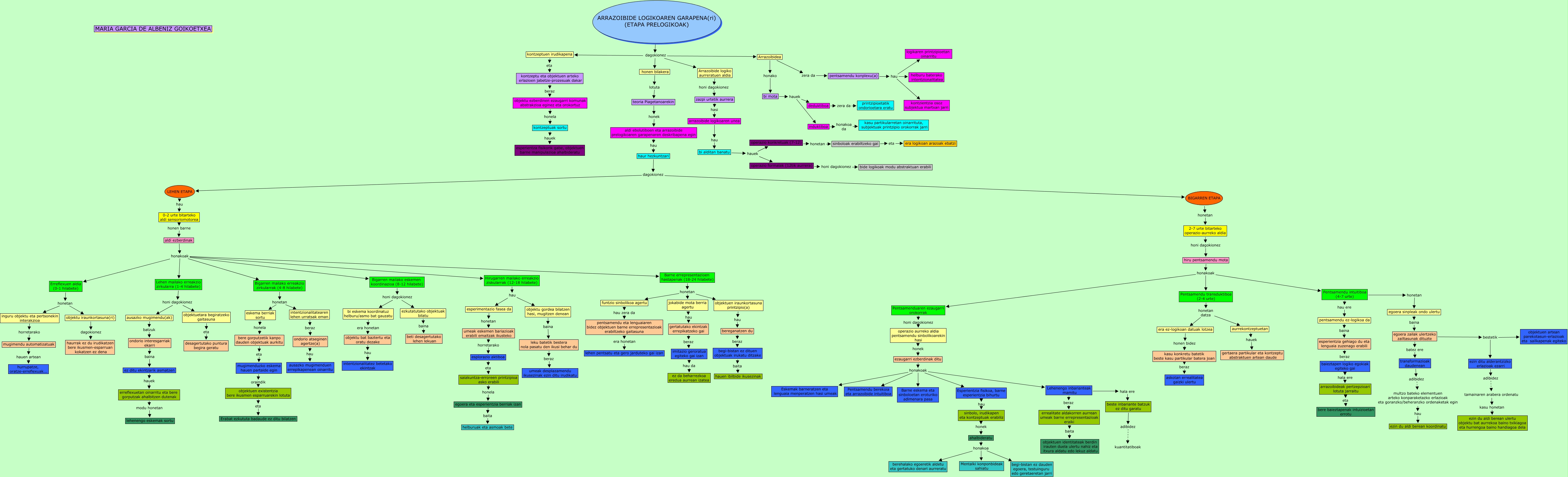 This Concept Map, created with IHMC CmapTools, has information related to: 4_mapa_Garcia de Albeniz_Goikoetxea, Bigarren mailako eskemen koordinazioa (8-12 hilabete) honi dagokionez bi eskema koordinatuz helburu/asmo bat gauzatu, aldi ezberdinak honakoak Lehen mailako erreakzio zirkularra (1-4 hilabete), esplorazio aktiboa eta saiakuntza-erroreen printzipioa asko erabili, objektu bat baztertu eta oratu dezake hau intentzionalitatez betetako ekintzak, kontzeptuak sortu hauek esperientza fisikorik gabe, objektuen barne manipulazioa ahalbideratu, objektuetara begiratzeko gaitasuna eta desagertutako puntura begira geratu, umeak eskemen bariazioak erabili emaitzak ikusteko horretarako esplorazio aktiboa, jokabide mota berria agertu hau gertatutako ekintzak errepikatzeko gai, Hirugarren mailako erreakzio ziskularrak (12-18 hilabete) hau esperimentazio fasea da, bere gorputzetik kanpo dauden objektuak aurkitu eta mugimenduzko eskema hauen partaide egin, pentsamendu eta lenguaiaren bidez objektuen barne errepresentazioak erabiltzeko gaitasuna era honetan lehen pentsatu eta gero jarduteko gai izan, ezaugarri ezberdinak ditu honakoak Eskemak barneratzen eta lenguaia menperatzen hasi umeak, mugimenduzko eskema hauen partaide egin oraindik objektuen existentzia bere ikusmen esparruarekin lotuta, pentsamendu ez-logikoa da baina esperientzia gehiago du eta lenguaia zuzenago erabili, bi mota hauek deduktiboa, objektu iraunkortasuna(ri) dagokionez haurrak ez du irudikatzen bere ikusmen-esparruan kokatzen ez dena, imitazio geroratua egiteko gai izan hau da ez da beharrezkoa eredua aurrean izatea, beste inbariante batzuk ez ditu garatu adibidez kuantitatiboak, Lehenengo inbarianteak mamitu hala ere beste inbariante batzuk ez ditu garatu, funtzio sinbolikoa agertu hau zera da pentsamendu eta lenguaiaren bidez objektuen barne errepresentazioak erabiltzeko gaitasuna