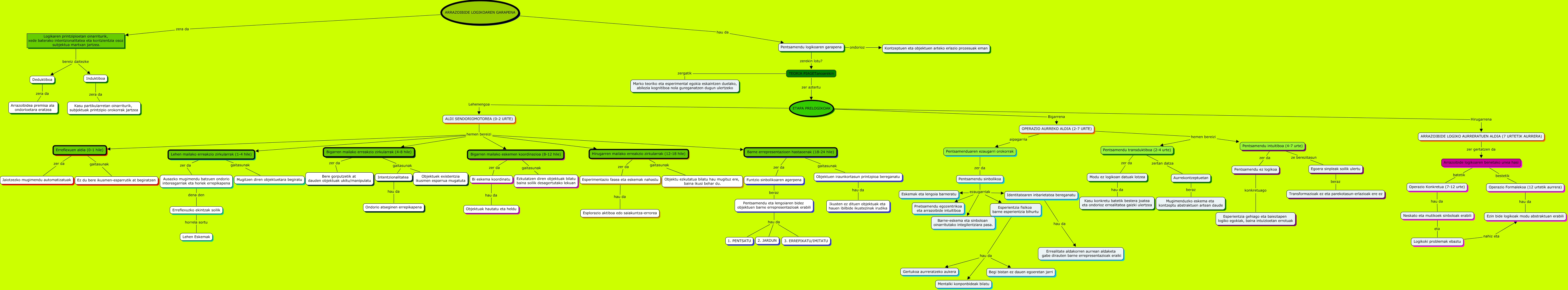 This Concept Map, created with IHMC CmapTools, has information related to: 4_mapa_Ibarretxe_Idigoras, Erreflexuen aldia (0-1 hile) gaitasunak Ez du bere ikusmen-esparrutik at begiratzen, Pentsamendu eta lengoiaren bidez objektuen barne errepresentazioak erabili hau da 3. ERREPIKATU/IMITATU, OPERAZIO AURREKO ALDIA (2-7 URTE) hemen bereizi Pentsamendu transduktiboa (2-4 urte), ETAPA PRELOGIKOAK Hirugarrena ARRAZOIBIDE LOGIKO AURRERATUEN ALDIA (7 URTETIK AURRERA), Bigarren mailako eskemen koordinazioa (8-12 hile) zer da Bi eskema koordinatu, Bigarren mailako erreakzio zirkularrak (4-8 hile) gaitasunak Intentzionalitatea, Ausazko mugimendu batzuen ondorio interesgarriak eta horiek errepikapena dena den Erreflexuzko ekintzak soilik, Identitatearen inbarietatea bereganatu hau da Errealitate aldakorren aurrean aldaketa gabe dirauten barne errepresentazioak eraiki, Logikaren printzipioetan oinarriturik, xede baterako intentzionalitatea eta kontzientzia osoz subjektua martxan jartzea. bereiz daitezke Induktiboa, Bigarren mailako erreakzio zirkularrak (4-8 hile) gaitasunak Objektuek existentzia ikusmen esparrua mugatuta, ALDI SENDORIOMOTOREA (0-2 URTE) hemen bereizi Hirugarren mailako erreakzio zirkularrak (12-18 hile), Bigarren mailako eskemen koordinazioa (8-12 hile) gaitasunak Ezkutatzen diren objektuak bilatu baina soilik desagertutako lekuan, Hirugarren mailako erreakzio zirkularrak (12-18 hile) gaitasunak Objektu ezkutatua bilatu hau mugituz ere, baina ikusi behar du., ALDI SENDORIOMOTOREA (0-2 URTE) hemen bereizi Bigarren mailako eskemen koordinazioa (8-12 hile), Erreflexuzko ekintzak soilik horrela sortu Lehen Eskemak, Induktiboa zera da Kasu partikularretan oinarriturik, subjektuak printzipio orokorrak jartzea, Pentsamendu transduktiboa (2-4 urte) zer da Modu ez logikoan datuak lotzea, Pentsamendu sinbolikoa ezaugarriak Barne-eskema eta sinboloan oinarritutako integilentziara pasa., Esperientzia fisikoa barne esperientzia bihurtu hau da Gertukoa aurreratzeko aukera, Esperimentazio fasea eta eskemak nahastu hau da Esplorazio aktiboa edo saiakuntza-errorea