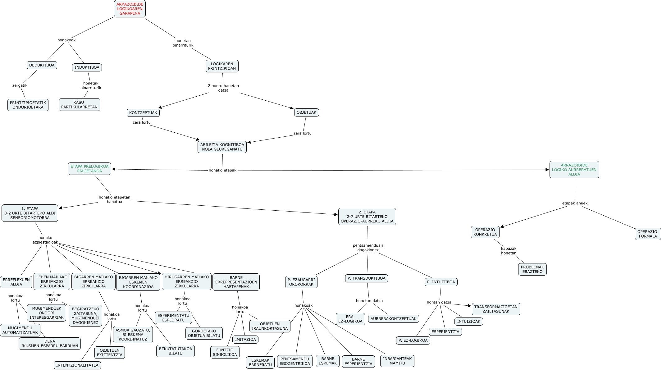 This Concept Map, created with IHMC CmapTools, has information related to: 4_mapa_Ayastuy_Antxia, ABILEZIA KOGNITIBOA NOLA GEUREGANATU honako etapak ARRAZOIBIDE LOGIKO AURRERATUEN ALDIA, DEDUKTIBOA zergatik PRINTZIPIOETATIK ONDORIOETARA, 1. ETAPA 0-2 URTE BITARTEKO ALDI SENSORIOMOTORRA honako azpiestadioak BIGARREN MAILAKO ESKEMEN KOORDINAZIOA, 1. ETAPA 0-2 URTE BITARTEKO ALDI SENSORIOMOTORRA honako azpiestadioak BIGARREN MAILAKO ERREAKZIO ZIRKULARRA, P. TRANSDUKTIBOA honetan datza ERA EZ-LOGIKOA, HIRUGARREN MAILAKO ERREAKZIO ZIRKULARRA honakoa lortu GORDETAKO OBJETUA BILATU, P. EZAUGARRI OROKORRAK honakoak BARNE ESKEMAK, 2. ETAPA 2-7 URTE BITARTEKO OPERAZIO-AURREKO ALDIA pentsamenduari dagokionez P. EZAUGARRI OROKORRAK, P. EZAUGARRI OROKORRAK honakoak INBARIANTEAK MAMITU, OPERAZIO KONKRETUA kapazak honetan PROBLEMAK EBAZTEKO, BIGARREN MAILAKO ESKEMEN KOORDINAZIOA honakoa lortu ASMOA GAUZATU, BI ESKEMA KOORDINATUZ, INDUKTIBOA honetak oinarriturik KASU PARTIKULARRETAN, 1. ETAPA 0-2 URTE BITARTEKO ALDI SENSORIOMOTORRA honako azpiestadioak LEHEN MAILAKO ERREAKZIO ZIRKULARRA, P. INTUITIBOA hontan datza INTUIZIOAK, BARNE ERREPRESENTAZIOEN HASTAPENAK honakoa lortu IMITAZIOA, P. INTUITIBOA hontan datza TRANSFORMAZIOETAN ZAILTASUNAK, LEHEN MAILAKO ERREAKZIO ZIRKULARRA honakoa lortu BEGIRATZEKO GAITASUNA, MUGIMENDUEI DAGOKIENEZ, ETAPA PRELOGIKOA PIAGETANOA honako etapetan banatua 1. ETAPA 0-2 URTE BITARTEKO ALDI SENSORIOMOTORRA, P. EZAUGARRI OROKORRAK honakoak PENTSAMENDU EGOZENTRIKOA, ARRAZOIBIDE LOGIKOAREN GARAPENA honetan oinarriturik LOGIKAREN PRINTZIPIOAN