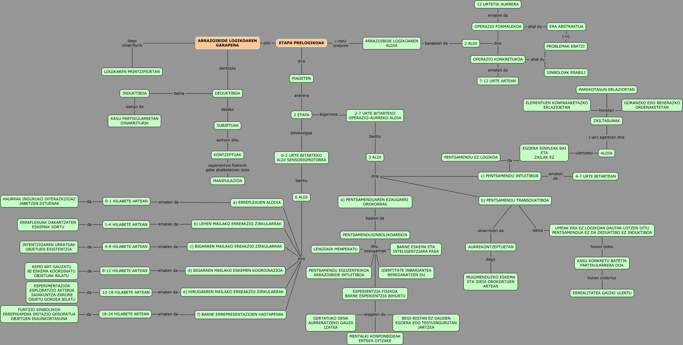 This Concept Map, created with IHMC CmapTools, has information related to: 4_mapa_remiro_ibanez, PENTSAMENDUSINBOLIKOAREKIN ditu ezaugarriak IDENTITATE INBARIANTEA BEREGANATZEN DU, 2 ALDI dira OPERAZIO FORMALEKOA, SUBJETUAK sortzen ditu KONTZEPTUAK, INDUKTIBOA izango da KASU PARTIKULARRETAN OINARRITURIK, c) PENTSAMENDU INTUITIBOA da PENTSAMENDU EZ LOGIKOA, ARRAZOIBIDE LOGIKOAREN GARAPENA dago oinarriturik LOGIKAREN PRINTZIPIOETAN, DEDUKTIBOA delako SUBJETUAK, 6 ALDI dira d) BIGARREN MAILAKO ESKEMEN KOORDINAZIOA, c) BIGARREN MAILAKO EREAKZIO ZIRKULARRAK ematen da 4-8 HILABETE ARTEAN, OPERAZIO KONKRETUKOA ematen da 7-12 URTE ARTEAN, ZAILTASUNAK honetan PAREKOTASUN ERLAZIOETAN, 0-1 HILABETE ARTEAN da HAURRAK INGURUKO INTERAZKZIOAZ JABETZEN DITUENAK, 12-18 HILABETE ARTEAN da ESPERIMENTAZIOA ESPLORATZIO AKTIBOA SAIAKUNTZA-ERRORE OBJETU GORDEA BILATU, OPERAZIO KONKRETUKOA ahal du PROBLEMAK EBATZI, ESPERIENTZIA FISIKOA BARNE ESPERIENTZIA BIHURTU eragiten du MENTALKI KONPONBIDEAK ENTSEA DITZAKE, PENTSAMENDUSINBOLIKOAREKIN ditu ezaugarriak LENGOAIA MENPERATU, AURREKONTZEPTUETAN dago MUGIMENDUZKO ESKEMA ETA IDEIA OROKORTUEN ARTEAN, ARRAZOIBIDE LOGIKOAREN GARAPENA deritzote DEDUKTIBOA, 2 ALDI dira OPERAZIO KONKRETUKOA, OPERAZIO FORMALEKOA ematen da 12 URTETIK AURRERA
