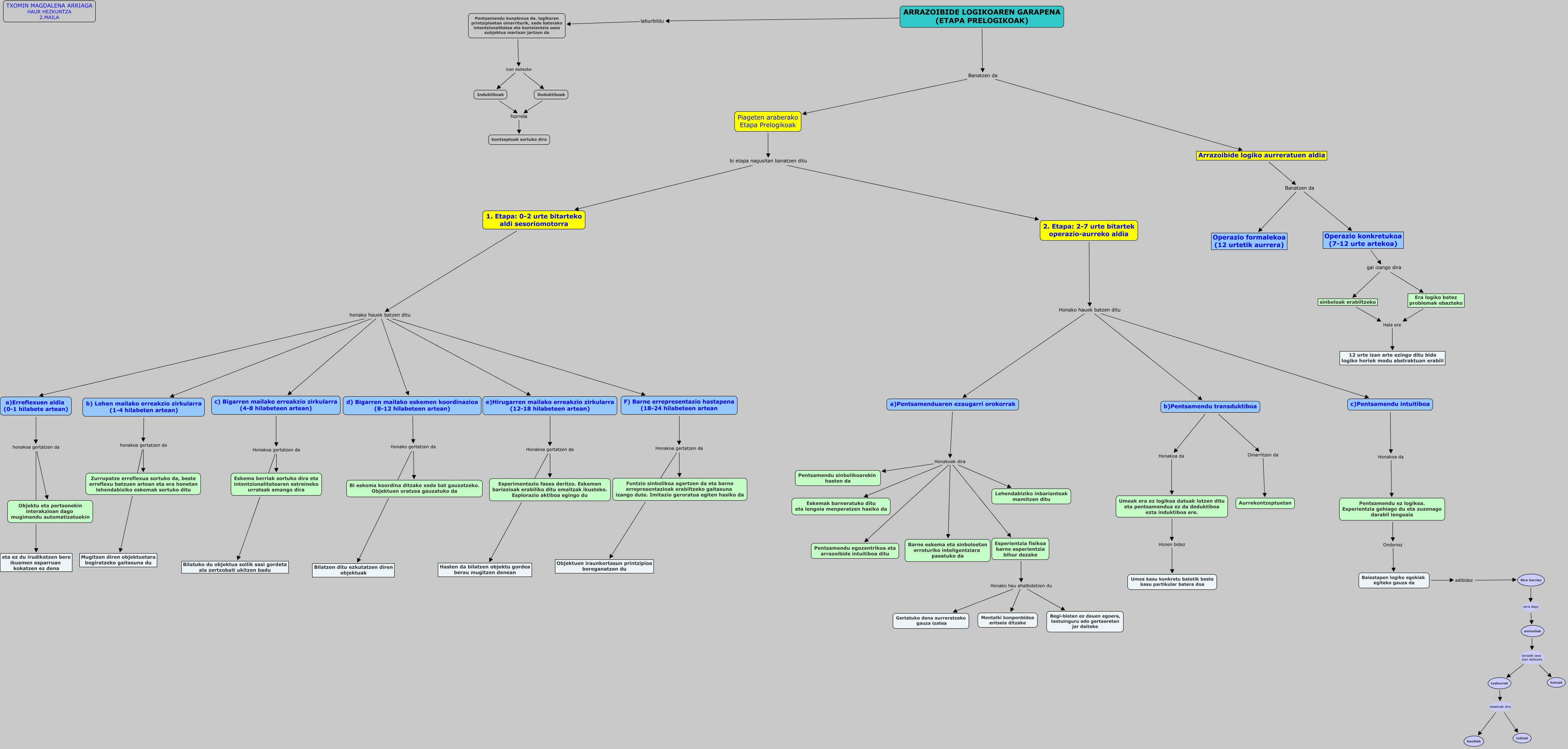 This Concept Map, created with IHMC CmapTools, has information related to: 4-mapa-magdalena-arriaga, b)Pentsamendu transduktiboa Honakoa da Umeak era ez logikoa datuak lotzen ditu eta pentsamendua ez da deduktiboa ezta induktiboa ere., c) Bigarren mailako erreakzio zirkularra (4-8 hilabeteen artean) Honakoa gertatzen da Eskema berriak sortuko dira eta intentzionalitatearen estreineko urratsak emango dira, 1. Etapa: 0-2 urte bitarteko aldi sesoriomotorra honako hauek batzen ditu b) Lehen mailako erreakzio zirkularra (1-4 hilabeten artean), b) Lehen mailako erreakzio zirkularra (1-4 hilabeten artean) honakoa gertatzen da Mugitzen diren objektuetara begiratzeko gaitasuna du, Operazio konkretukoa (7-12 urte artekoa) gai izango dira Era logiko batez problemak ebazteko, d) Bigarren mailako eskemen koordinazioa (8-12 hilabeteen artean) Honako gertatzen da Bilatzen ditu ezkutatzen diren objektuak, F) Barne errepresentazio hastapena (18-24 hilabeteen artean Honakoa gertatzen da Objektuen iraunkortasun printzipioa bereganatzen du, Pentsamendu konplexua da. logikaren printzipioetan oinarriturik, xede baterako intentzionalitatea eta kontzientzia osoz subjektua martxan jartzen da izan daitezke Induktiboak, b) Lehen mailako erreakzio zirkularra (1-4 hilabeten artean) honakoa gertatzen da Zurrupatze erreflexua sortuko da, beste erreflexu batzuen artean eta era honetan lehendabiziko eskemak sortuko ditu, e)Hirugarren mailako erreakzio zirkularra (12-18 hilabeteen artean) Honakoa gertatzen da Esperimentazio fasea deritzo. Eskemen bariazioak erabiliko ditu emaitzak ikusteko. Esplorazio aktiboa egingo du, ARRAZOIBIDE LOGIKOAREN GARAPENA (ETAPA PRELOGIKOAK) Banatzen da Piageten araberako Etapa Prelogikoak, Operazio konkretukoa (7-12 urte artekoa) gai izango dira sinboloak erabiltzeko, Pentsamendu ez logikoa. Esperientzia gehiago du eta zuzenago darabil lengoaia Ondorioz Baieztapen logiko egokiak egiteko gauza da, Induktiboak horrela kontzeptuak sortuko dira, Umeak era ez logikoa datuak lotzen ditu eta pentsamendua ez da deduktiboa ezta induktiboa ere. Honen bidez Umea kasu konkretu batetik beste kasu partikular batera doa, a)Pentsamenduaren ezaugarri orokorrak Honakoak dira Esperientzia fisikoa barne esperientzia bihur dezake, Pentsamendu konplexua da. logikaren printzipioetan oinarriturik, xede baterako intentzionalitatea eta kontzientzia osoz subjektua martxan jartzen da izan daitezke Deduktiboak, txakurrak halakoak dira txikiak, Nire herrian zera dago animaliak, a)Pentsamenduaren ezaugarri orokorrak Honakoak dira Pentsamendu sinbolikoarekin hasten da