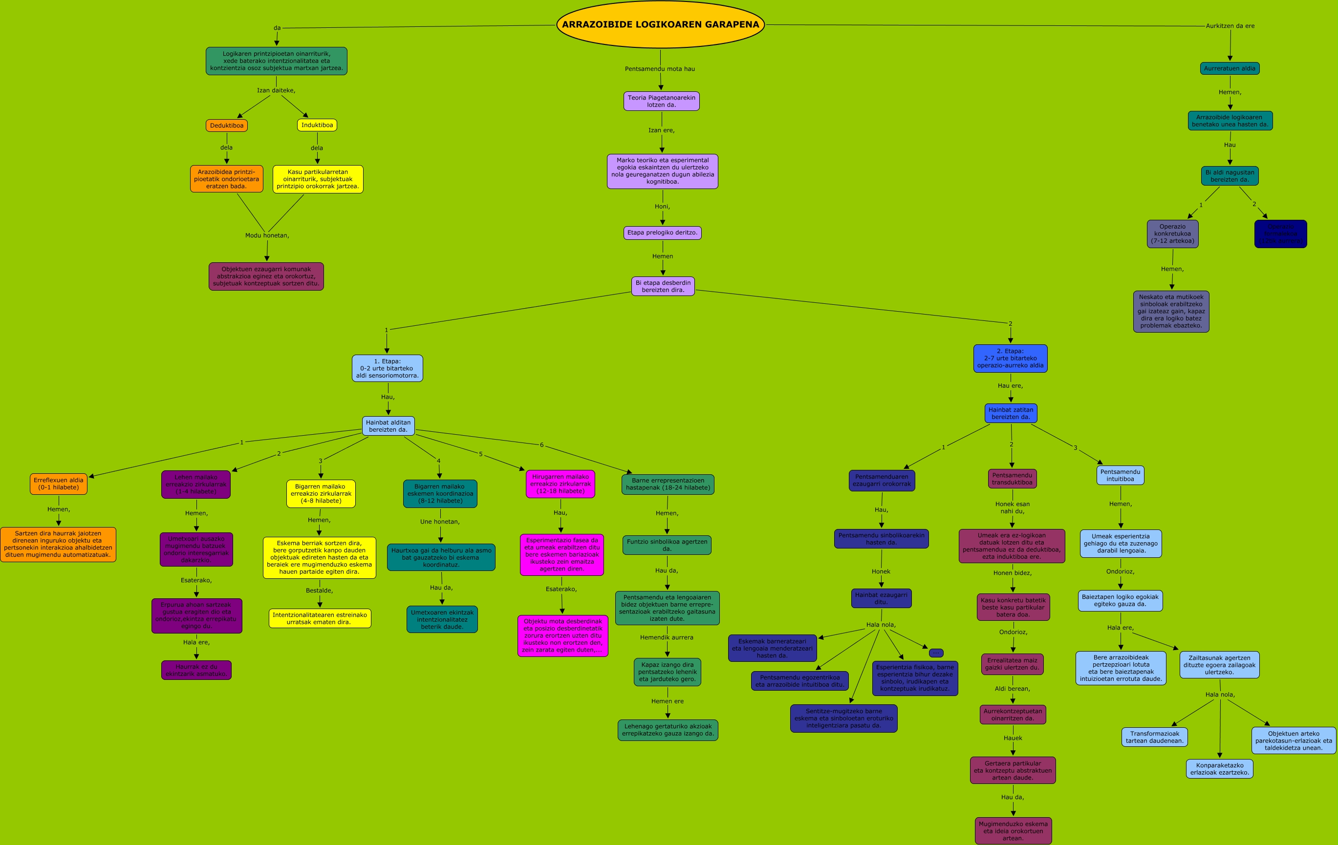This Concept Map, created with IHMC CmapTools, has information related to: 4_mapa_Mitxelena_Mujika, ARRAZOIBIDE LOGIKOAREN GARAPENA Aurkitzen da ere Aurreratuen aldia, Hainbat ezaugarri ditu. Hala nola, ..., Arrazoibide logikoaren benetako unea hasten da. Hau Bi aldi nagusitan bereizten da., Kapaz izango dira pentsatzeko lehenik eta jarduteko gero. Hemen ere Lehenago gertaturiko akzioak errepikatzeko gauza izango da., 1. Etapa: 0-2 urte bitarteko aldi sensoriomotorra. Hau, Hainbat alditan bereizten da., Kasu konkretu batetik beste kasu partikular batera doa. Ondorioz, Errealitatea maiz gaizki ulertzen du., Bi aldi nagusitan bereizten da. 2 Operazio formalekoa (12tik aurrera), Hainbat ezaugarri ditu. Hala nola, Pentsamendu egozentrikoa eta arrazoibide intuitiboa ditu., Errealitatea maiz gaizki ulertzen du. Aldi berean, Aurrekontzeptuetan oinarritzen da., Bi etapa desberdin bereizten dira. 1 1. Etapa: 0-2 urte bitarteko aldi sensoriomotorra., Hainbat ezaugarri ditu. Hala nola, Sentitze-mugitzeko barne eskema eta sinboloetan eroturiko inteligentziara pasatu da., Aurreratuen aldia Hemen, Arrazoibide logikoaren benetako unea hasten da., Baieztapen logiko egokiak egiteko gauza da. Hala ere, Bere arrazoibideak pertzepzioari lotuta eta bere baieztapenak intuizioetan errotuta daude., Umetxoari ausazko mugimendu batzuek ondorio interesgarriak dakarzkio. Esaterako, Erpurua ahoan sartzeak gustua eragiten dio eta ondorioz,ekintza errepikatu egingo du., Zailtasunak agertzen dituzte egoera zailagoak ulertzeko. Hala nola, Konparaketazko erlazioak ezartzeko., Kasu partikularretan oinarriturik, subjektuak printzipio orokorrak jartzea. Modu honetan, Objektuen ezaugarri komunak abstrakzioa eginez eta orokortuz, subjetuak kontzeptuak sortzen ditu., Hainbat alditan bereizten da. 3 Bigarren mailako erreakzio zirkularrak (4-8 hilabete), Funtzio sinbolikoa agertzen da. Hau da, Pentsamendu eta lengoaiaren bidez objektuen barne errepre- sentazioak erabiltzeko gaitasuna izaten dute., Arazoibidea printzi- pioetatik ondorioetara eratzen bada. Modu honetan, Objektuen ezaugarri komunak abstrakzioa eginez eta orokortuz, subjetuak kontzeptuak sortzen ditu., Pentsamendu transduktiboa Honek esan nahi du, Umeak era ez-logikoan datuak lotzen ditu eta pentsamendua ez da deduktiboa, ezta induktiboa ere.