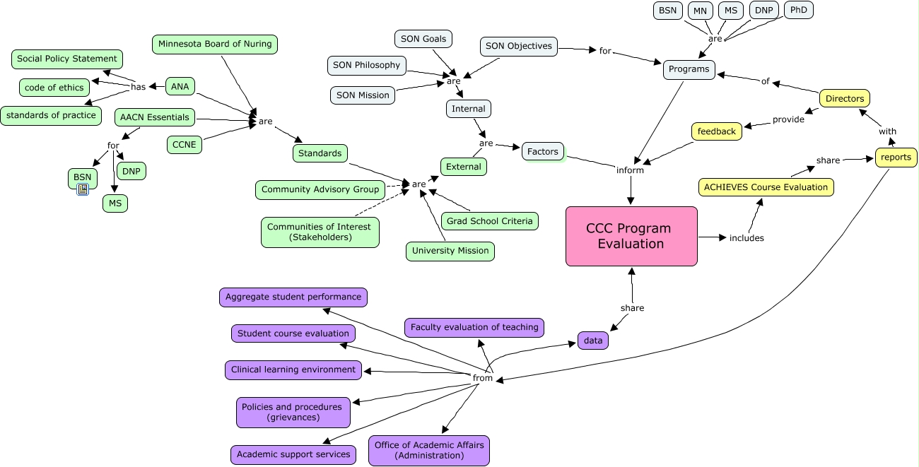 This Concept Map, created with IHMC CmapTools, has information related to: Mad map 4 Dec CCC, Internal are Factors, DNP are Programs, Standards are External, Minnesota Board of Nuring are Standards, MS are Programs, SON Philosophy are Internal, External are Factors, AACN Essentials for BSN, ANA has Social Policy Statement, BSN are Programs, reports from Aggregate student performance, CCC Program Evaluation includes ACHIEVES Course Evaluation, AACN Essentials are Standards, AACN Essentials for DNP, reports from Faculty evaluation of teaching, reports from Office of Academic Affairs (Administration), reports from Clinical learning environment, reports from Policies and procedures (grievances), ACHIEVES Course Evaluation share reports, ANA are Standards