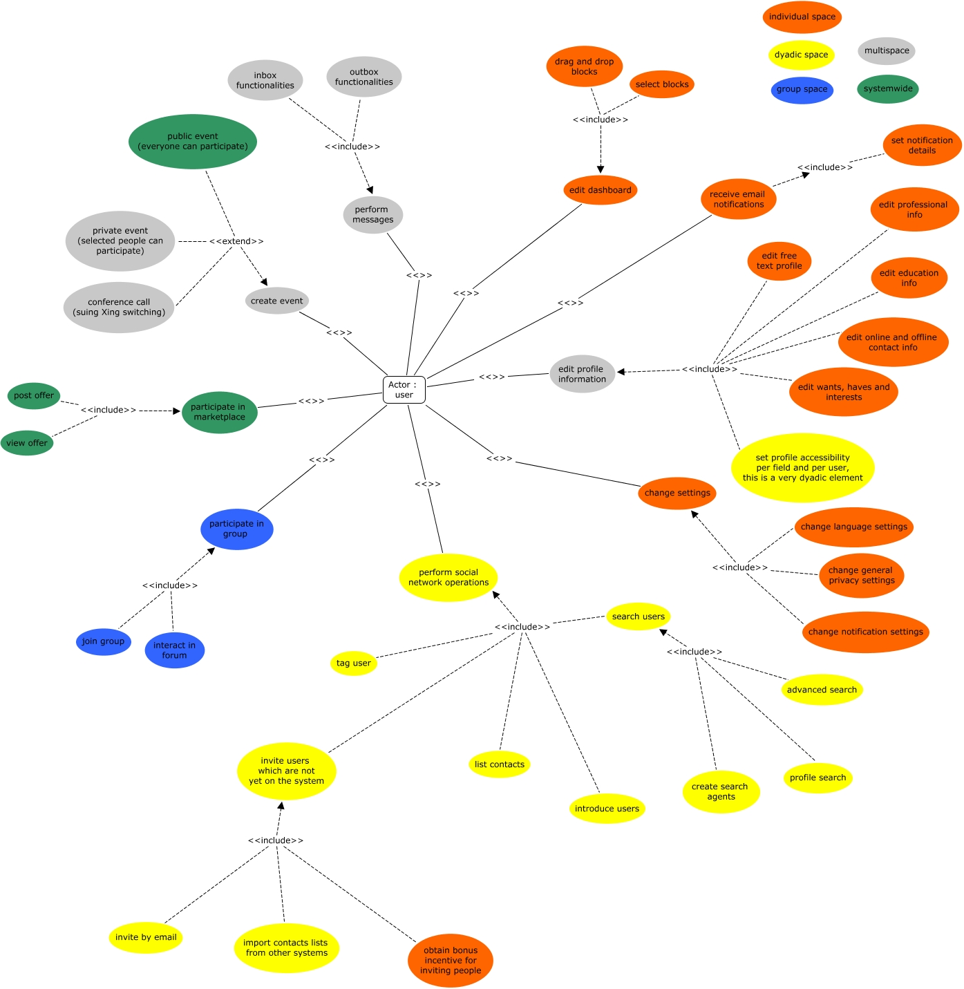 This Concept Map, created with IHMC CmapTools, has information related to: Xing use case diagram, Actor : user <<>> change settings, receive email notifications <<include>> set notification details, Actor : user <<>> receive email notifications, Actor : user <<>> perform messages, Actor : user <<>> edit profile information, Actor : user <<>> participate in group, Actor : user <<>> participate in marketplace, Actor : user <<>> create event, Actor : user <<>> perform social network operations, Actor : user <<>> edit dashboard