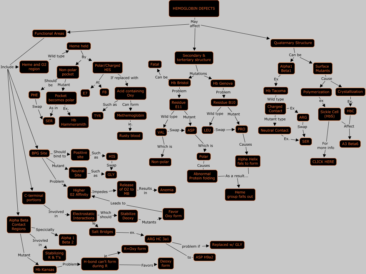 This Concept Map, created with IHMC CmapTools, has information related to: Problems with Hemoglobin, Release of O2 to MB Results in Anemia, Favor Oxy form Leads to Higher 02 Affinity, Residue B10 Wild type LEU, Higher 02 Affinity Impedes Release of O2 to MB, Stabilize Deoxy Mutants Favor Oxy form, VAL Swap ASP, Residue B10 Mutant PRO, Non-polar pocket Mutant Pocket becomes polar, Hb Bristol Can be Fatal, HEMOGLOBIN DEFECTS May affect Functional Areas, BPG Site Should bind to Positive site, ARG HC 3a1 to ASP H9a2, Functional Areas Include C-terminal portions, Quaternary Structure Can be Alpha1 Beta1, Salt Bridges ex. ARG HC 3a1, Residue E11 Mutant ASP, Hb Bristol Problem Residue E11, Pocket becomes polar As in SER, Electrostatic Interactions ie. Salt Bridges, Pocket becomes polar Ex. Hb Hammersmith