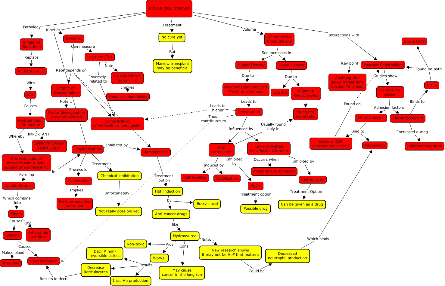 This Concept Map, created with IHMC CmapTools, has information related to: Sickle Cell Anemia, A3 Beta 6 GLU With VAL, SICKLE CELL DISEASE Treatment No cure yet, Lower Density Due to Low Hb, SS reticulcytes Bind to Fibronectin, Lag time (Td) Inversely related to Concentration of intercellular hemoglobin, Hydroxyurea Cons May cause cancer in the long run, SICKLE CELL DISEASE Pathology Single AA Substition, Hydroxyurea Pros Non-toxic, Degree of Deoxigination Note... Faster deoxigination prevents sickling, SS red cells= broad density See increases in Higher Density, Polymerization Inhibited by Hemoglobin F, SS red cells= broad density See increases in Lower Density, Sickling Makes blood Insoluble, Vascular Endothelium Studies show SS cells are stickier, SICKLE CELL DISEASE Kinetics Dynamic, Single AA Substition Replace A3 Beta 6 GLU, Lag time (Td) Note Usually transit times < Td, Hydrophobic Interaction Whereby One Beta subunit interacts with a Beta subunit of a different Hb, Ca++ activated K+ effusion (Gardos) Occurrs when Membrane is damaged, Ca++ activated K+ effusion (Gardos) Inhibited by Clotrimazole