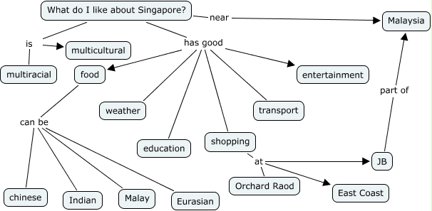 This Concept Map, created with IHMC CmapTools, has information related to: tzeminSG, What do I like about Singapore? has good food, What do I like about Singapore? has good weather, What do I like about Singapore? has good entertainment, What do I like about Singapore? near Malaysia, What do I like about Singapore? is multicultural, food can be Indian, food can be Eurasian, What do I like about Singapore? has good shopping, What do I like about Singapore? has good education, shopping at Orchard Raod, JB part of Malaysia, food can be chinese, What do I like about Singapore? is multiracial, What do I like about Singapore? has good transport, shopping at JB, shopping at East Coast, food can be Malay