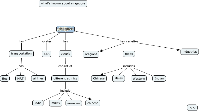 This Concept Map, created with IHMC CmapTools, has information related to: singapore-ddd, different ethnics include eurasian, different ethnics include chinese, transportation has airlines, singapore has varieties religions, singapore has people, singapore has varieties industries, foods includes Indian, transportation has Bus, singapore has varieties foods, different ethnics include india, foods includes Malay, different ethnics include malay, transportation has MRT, foods includes Chinese, people consist of different ethnics, singapore locates SEA, singapore has transportation, foods includes Western