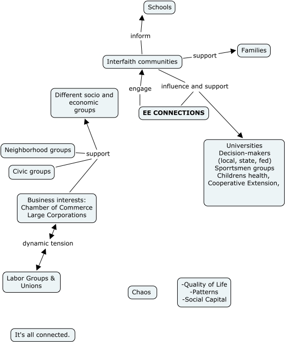 This Concept Map, created with IHMC CmapTools, has information related to: NEEEA07-B2 Audience, Civic groups support Different socio and economic groups, Interfaith communities support Families, Neighborhood groups support Different socio and economic groups, Interfaith communities influence and support Universities Decision-makers (local, state, fed) Sporrtsmen groups Childrens health, Cooperative Extension,, EE CONNECTIONS influence and support Universities Decision-makers (local, state, fed) Sporrtsmen groups Childrens health, Cooperative Extension,, EE CONNECTIONS engage Interfaith communities, Business interests: Chamber of Commerce Large Corporations support Different socio and economic groups, Interfaith communities inform Schools