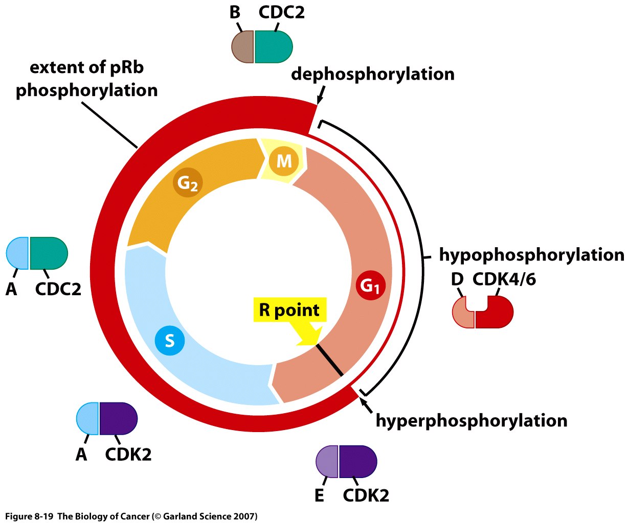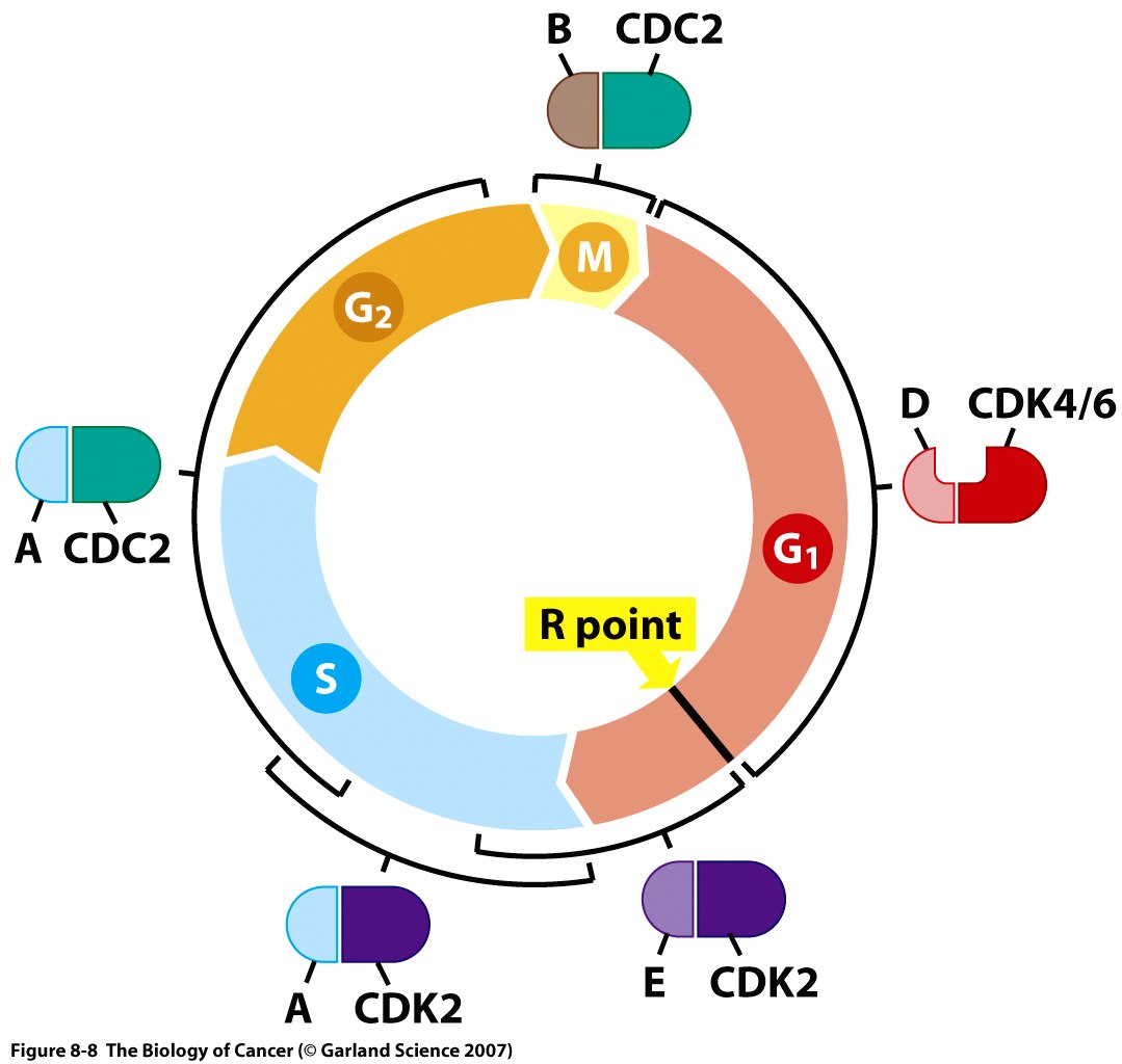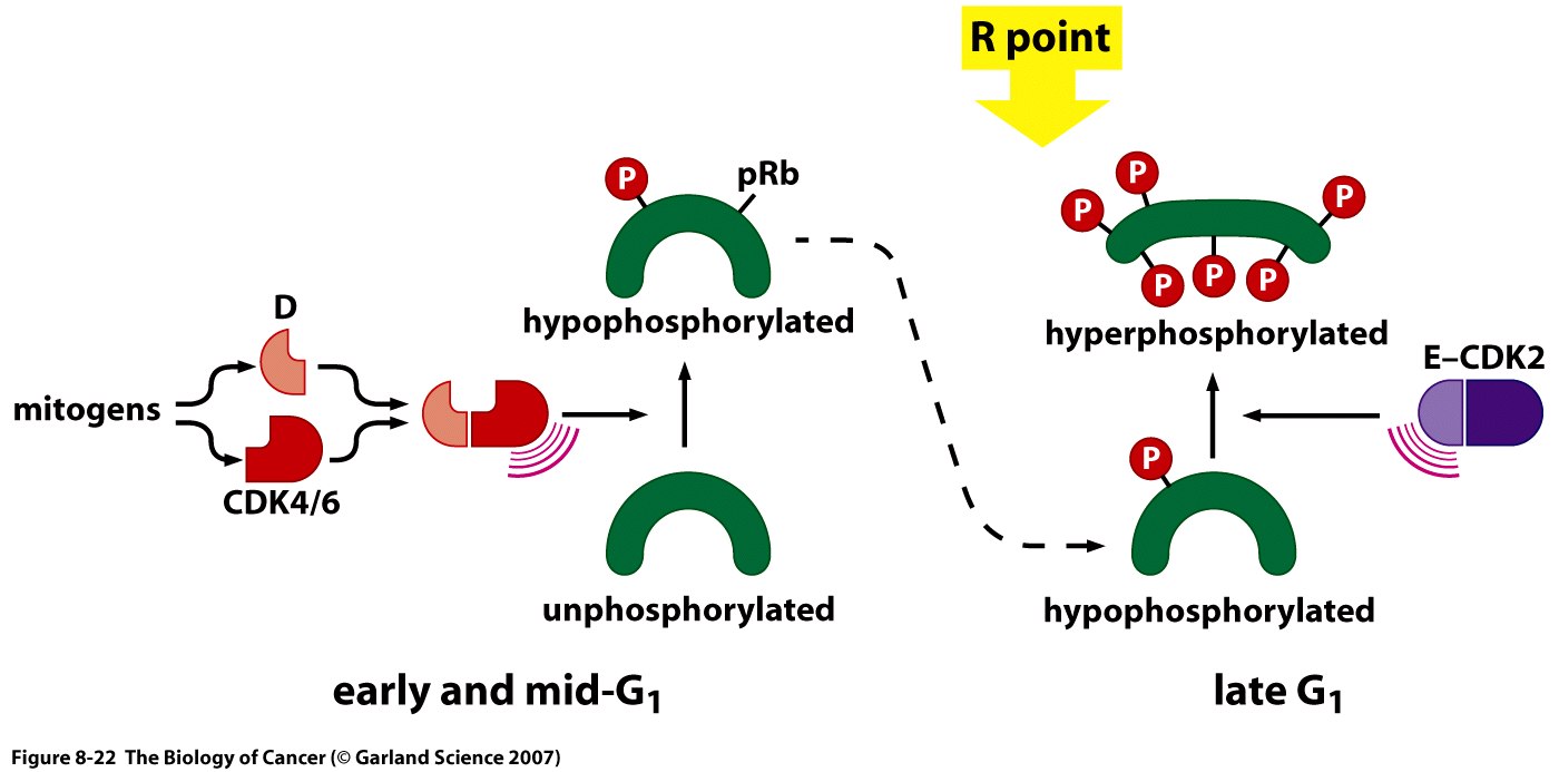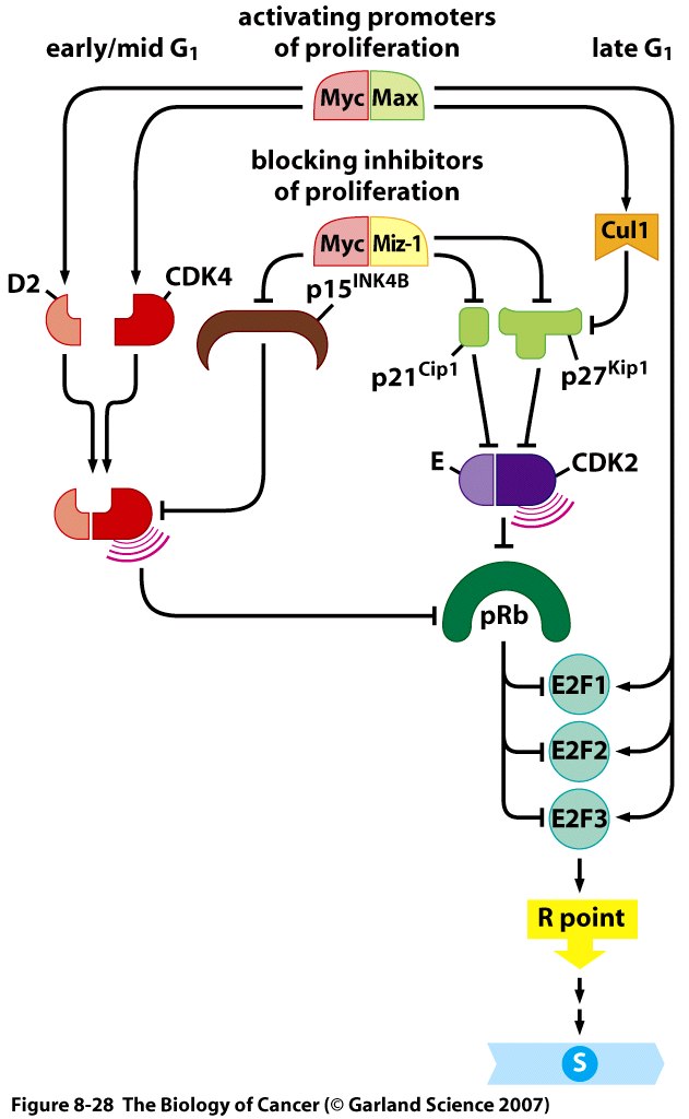 This Concept Map has information related to: Chapter 8 Disussion mappRB and cell cycle, Myc/|Max causes Id2, G0 cells are can go back to Cell Cycle, removing a key protein e.g. degrading cyclin in a proteosome, Cyclin-dependant Kinases inhibited by CDK inhibitors, Cell cycle contains Check points, Protiens that can be phosphorylated in multiple places can be completely phosphorylated, TGF Beta activates to a lesser degree p27, pRb plays a big role in cancer, Cell cycle eg Dividing cells, Check points prevent things from going forward
