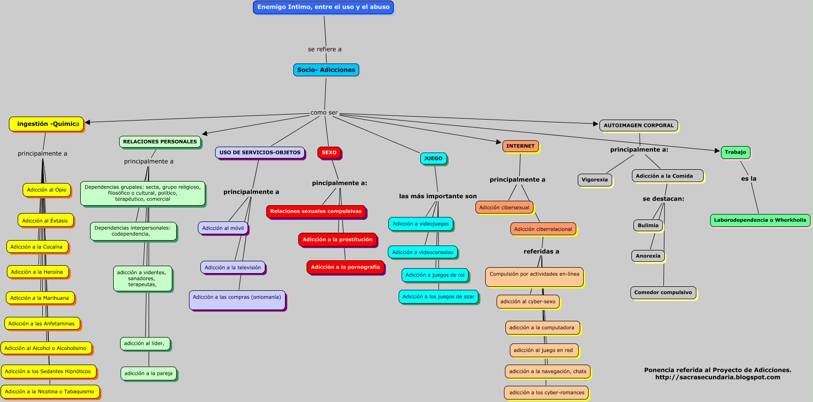 Este mapa conceptual tiene información relacionada a: Socio-Adicc_Ponencia02, Adicción a la Comida se destacan: Bulimia, Socio- Adicciones como ser AUTOIMAGEN CORPORAL, Socio- Adicciones como ser JUEGO, ingestión -Química principalmente a Adicción a la Marihuana, RELACIONES PERSONALES principalmente a adicción a videntes, sanadores, terapeutas,, RELACIONES PERSONALES principalmente a Dependencias interpersonales: codependencia,, SEXO pincipalmente a: Adicción a la pornografía, USO DE SERVICIOS-OBJETOS principalmente a Adicción al móvil, Socio- Adicciones como ser SEXO, Adicción ciberrelacional referidas a Compulsión por actividades en-línea