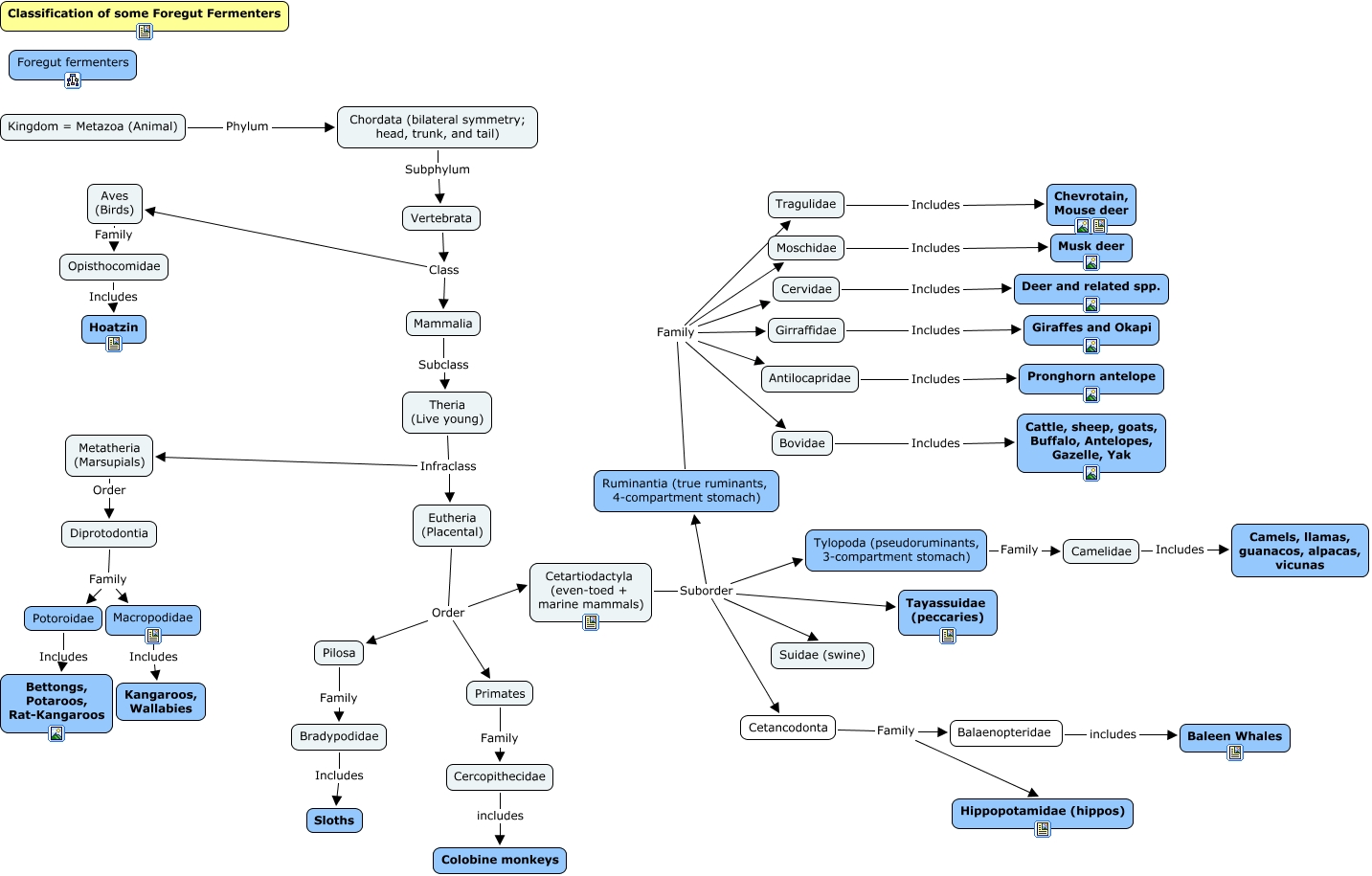 This Concept Map has information related to: ASC684 Classification, Chordata (bilateral symmetry; head, trunk, and tail) Subphylum Vertebrata, Cervidae Includes Deer and related spp., Primates Family Cercopithecidae, Cetartiodactyla (even-toed + marine mammals) Suborder Tylopoda (pseudoruminants, 3-compartment stomach), Vertebrata Class Mammalia, Eutheria (Placental) Order Cetartiodactyla (even-toed + marine mammals), Cetancodonta Family Hippopotamidae (hippos), Metatheria (Marsupials) Order Diprotodontia, Potoroidae Includes Bettongs, Potaroos, Rat-Kangaroos, Vertebrata Class Aves (Birds)