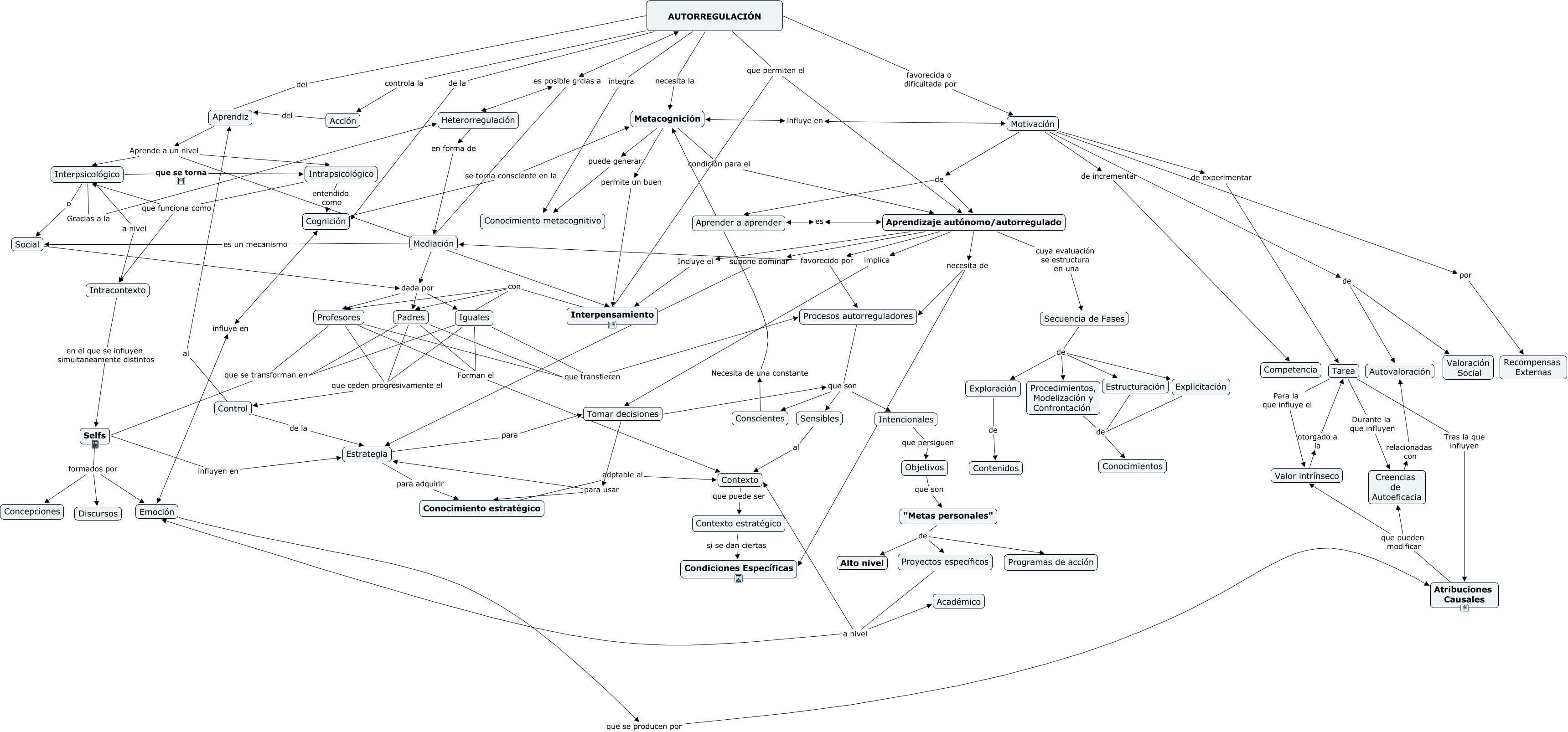 Este mapa conceptual tiene información relacionada a: AUTORREGULACIÓN ALEX, Control de la Estrategia, Tarea Para la que influye el Valor intrínseco, Padres que se transforman en Selfs, Aprendizaje autónomo/autorregulado es Aprender a aprender, Heterorregulación en forma de Mediación, Procesos autorreguladores que son Conscientes, Intrapsicológico que funciona como Intracontexto, Profesores que se transforman en Selfs, Tarea Durante la que influyen Creencias de Autoeficacia, Motivación por Recompensas Externas, Mediación es posible grcias a Heterorregulación, "Metas personales" de Alto nivel, Aprendizaje autónomo/autorregulado Incluye el Interpensamiento, Control al Aprendiz, Interpsicológico o Social, Procesos autorreguladores que son Sensibles, Exploración de Contenidos, Interpsicológico a nivel Intracontexto, Intracontexto en el que se influyen simultaneamente distintos Selfs, Aprendiz Aprende a un nivel Intrapsicológico