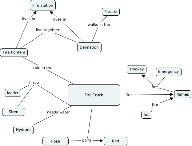 This Concept Map, created with IHMC CmapTools, has information related to: Fire Truck, Fire Truck parts Red, Fire Truck fire flames, Siren has a Fire Truck, Fire fighters live together Dalmation, Fire fighters ride in the Fire Truck, Dalmation lives in Fire station, Emergency fire smokey, flames fire smokey, ladder has a Fire Truck, Hose parts Red, Fire fighters lives in Fire station, Parade walks in the Dalmation, Fire Truck needs water Hydrant, hot fire flames