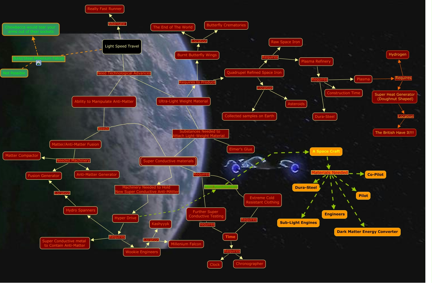 Kevin Estelle... Cmap Project, Super Conductive materials Machinery Needed to Hold New Super Conductive Anti-MAtter Hyper Drive, Ultra-Light Weight Material Substances Needed to Attach Light-Weight Material Super Conductive materials, Ultra-Light Weight Material Requires to Produce Quadrupel Refined Space Iron, Quadrupel Refined Space Iron Requires Plasma Refinery, Super Conductive materials Requires Further Super Conductive Testing, Wookie Engineers Location Millenium Falcon, Wookie Engineers Location Kashyyyk, Burnt Butterfly Wings Location The End of The World, Burnt Butterfly Wings Location Butterfly Crematories, Plasma Requires Super Heat Generator (Doughnut Shaped)