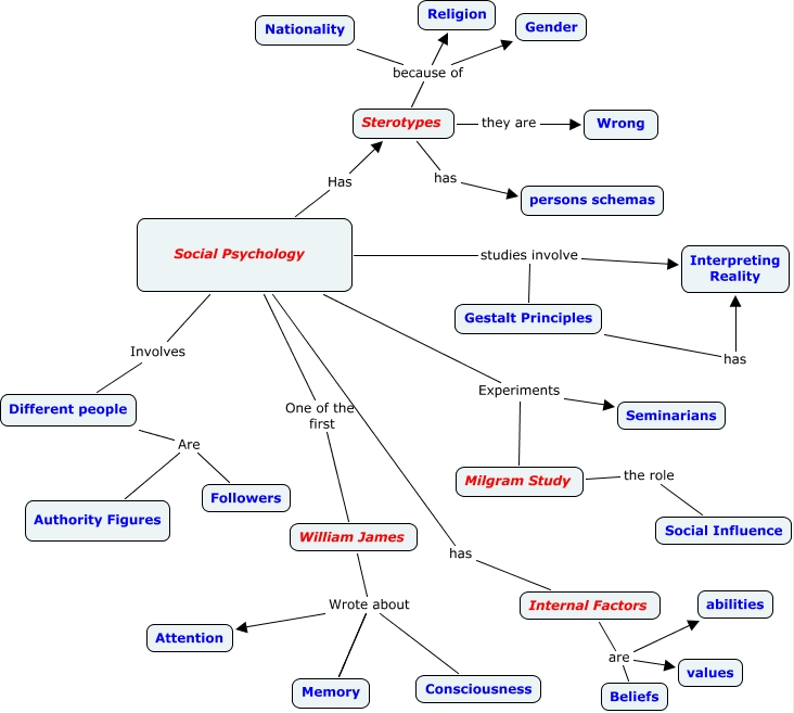 This Concept Map, created with IHMC CmapTools, has information related to: cmap2, Milgram Study the role Social Influence, Social Psychology studies involve Gestalt Principles, William James Wrote about Attention, Sterotypes because of Gender, Social Psychology Involves Different people, Social Psychology Has Sterotypes, Nationality because of Religion, Social Psychology One of the first William James, Sterotypes they are Wrong, Social Psychology studies involve Interpreting Reality, Gestalt Principles has Interpreting Reality, Sterotypes because of Religion, Social Psychology has Internal Factors, Social Psychology Experiments Seminarians, William James Wrote about Memory, Different people Are Followers, Nationality because of Gender, Internal Factors are Beliefs, William James Wrote about Memory, Social Psychology Experiments Milgram Study