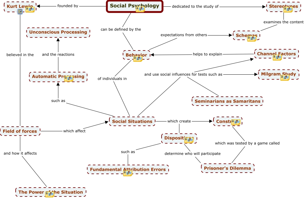 This Concept Map, created with IHMC CmapTools, has information related to: Cmap 2, Social Psychology founded by Kurt Lewin, Social Situations such as Automatic Processing, Stereotypes examines the content Schemas, Dispositions determine who will participate Prisoner's Dilemma, Social Situations and use social influences for tests such as Seminarians as Samaritans, Channel Factors helps to explain Behavior, Social Situations which create Dispositions, Dispositions such as Fundamental Attribution Errors, Social Psychology dedicated to the study of Stereotypes, Kurt Lewin believed in the Field of forces, Automatic Processing and the reactions Unconscious Processing, Behavior of individuals in Social Situations, Field of forces which affect Social Situations, Construal which was tested by a game called Prisoner's Dilemma, Behavior expectations from others Schemas, Field of forces and how it affects The Power of the Situation, Social Situations which create Construal, Social Psychology can be defined by the Behavior, Social Situations and use social influences for tests such as Channel Factors, Social Situations and use social influences for tests such as Milgram Study