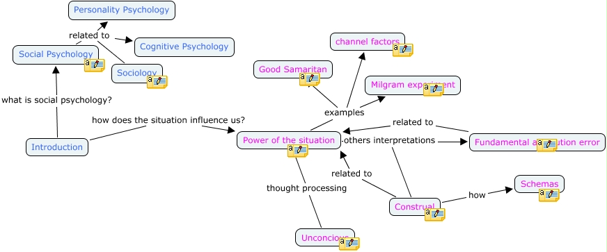 This Concept Map has information related to: Introduction, Fundamental attribution error related to Power of the situation, Construal how Schemas, Power of the situation others interpretations Fundamental attribution error, Introduction how does the situation influence us? Power of the situation, Construal related to Power of the situation, Power of the situation thought processing Unconcious, Power of the situation others interpretations Construal, Power of the situation examples channel factors, Power of the situation examples Good Samaritan, Social Psychology related to Sociology