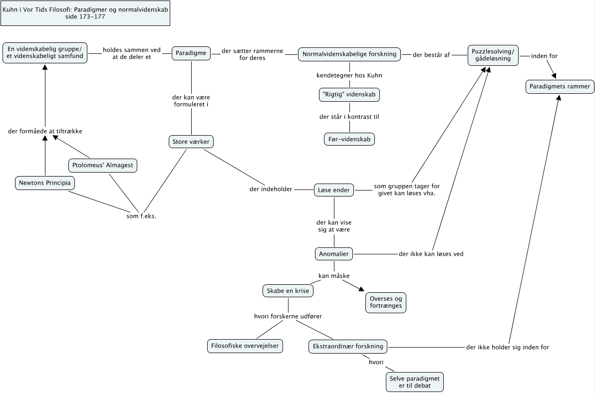This Concept Map has information related to: Kuhn - VorTidsFilosofi - Paradigmer og normalvidenskab, Paradigme der sætter rammerne for deres Normalvidenskabelige forskning, Anomalier kan måske Skabe en krise, Skabe en krise hvori forskerne udfører Ekstraordinær forskning, Skabe en krise hvori forskerne udfører Filosofiske overvejelser, Store værker som f.eks. Newtons Principia, "Rigtig" videnskab der står i kontrast til Før-videnskab, Løse ender der kan vise sig at være Anomalier, Store værker som f.eks. Ptolomeus' Almagest, Ekstraordinær forskning hvori Selve paradigmet er til debat, Paradigme der kan være formuleret i Store værker