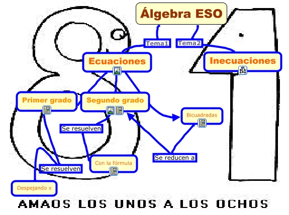 Este mapa conceptual tiene información relacionada a: index, Segundo grado Se resuelven Con la fórmula, Ecuaciones Primer grado, Bicuadradas Se reducen a Segundo grado, Ecuaciones Segundo grado, Ecuaciones Bicuadradas, Primer grado Se resuelven Despejando x, Álgebra ESO Tema1 Ecuaciones, Álgebra ESO Tema2 Inecuaciones