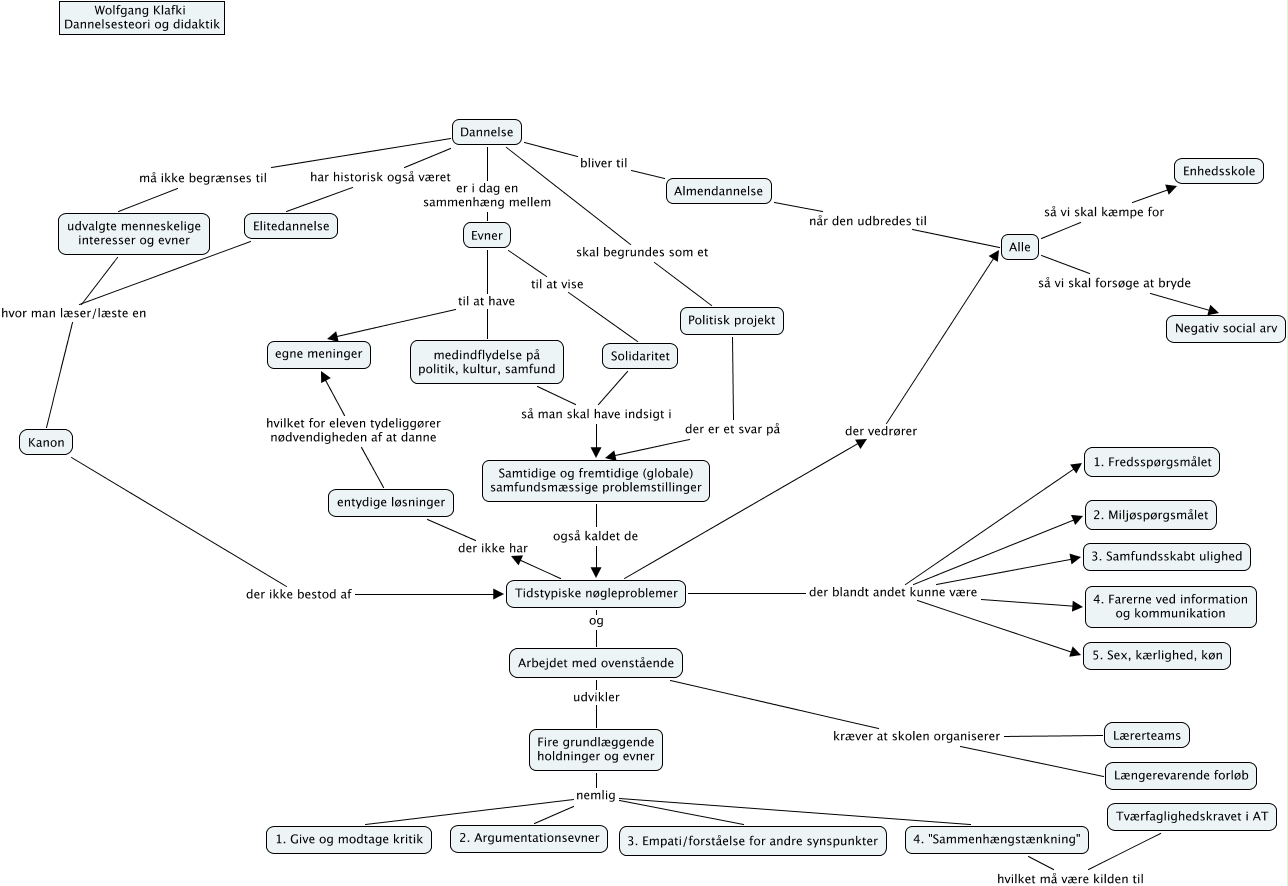 This Concept Map has information related to: Klafki - Dannelsesteori og Didaktik, Dannelse må ikke begrænses til udvalgte menneskelige interesser og evner, Dannelse bliver til Almendannelse, 4. "Sammenhængstænkning" hvilket må være kilden til Tværfaglighedskravet i AT, Fire grundlæggende holdninger og evner nemlig 1. Give og modtage kritik, Tidstypiske nøgleproblemer der blandt andet kunne være 1. Fredsspørgsmålet, Tidstypiske nøgleproblemer der blandt andet kunne være 3. Samfundsskabt ulighed, Dannelse er i dag en sammenhæng mellem Evner, Arbejdet med ovenstående kræver at skolen organiserer Længerevarende forløb, Tidstypiske nøgleproblemer der blandt andet kunne være 2. Miljøspørgsmålet, Solidaritet så man skal have indsigt i Samtidige og fremtidige (globale) samfundsmæssige problemstillinger
