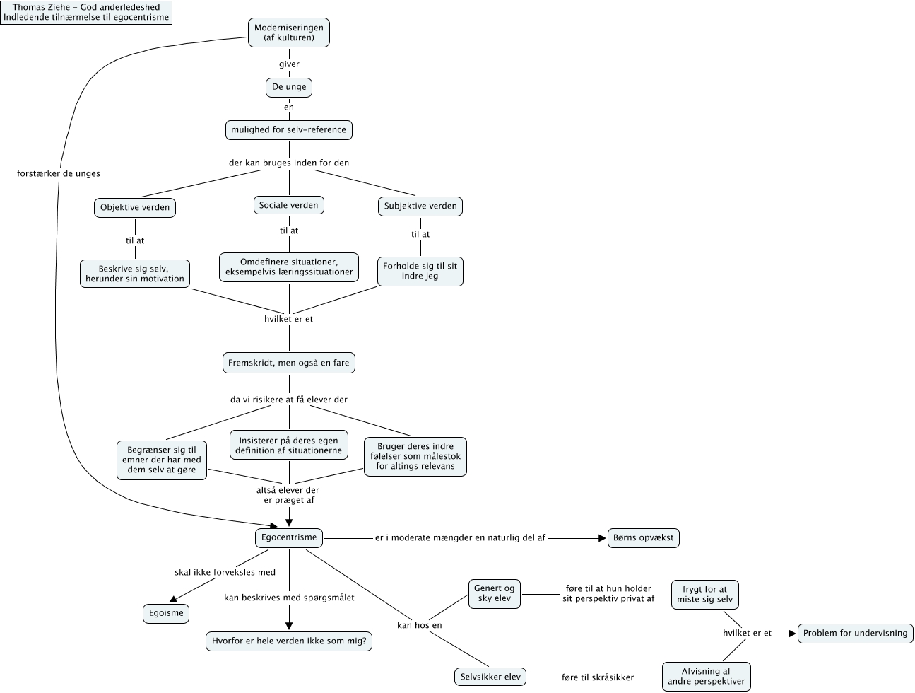 This Concept Map has information related to: Ziehe - god anderledeshed - del2, Forholde sig til sit indre jeg hvilket er et Fremskridt, men også en fare, frygt for at miste sig selv hvilket er et Problem for undervisning, Genert og sky elev føre til at hun holder sit perspektiv privat af frygt for at miste sig selv, Fremskridt, men også en fare da vi risikere at få elever der Bruger deres indre følelser som målestok for altings relevans, Moderniseringen (af kulturen) giver De unge, Egocentrisme skal ikke forveksles med Egoisme, Fremskridt, men også en fare da vi risikere at få elever der Begrænser sig til emner der har med dem selv at gøre, Afvisning af andre perspektiver hvilket er et Problem for undervisning, Omdefinere situationer, eksempelvis læringssituationer hvilket er et Fremskridt, men også en fare, Sociale verden til at Omdefinere situationer, eksempelvis læringssituationer