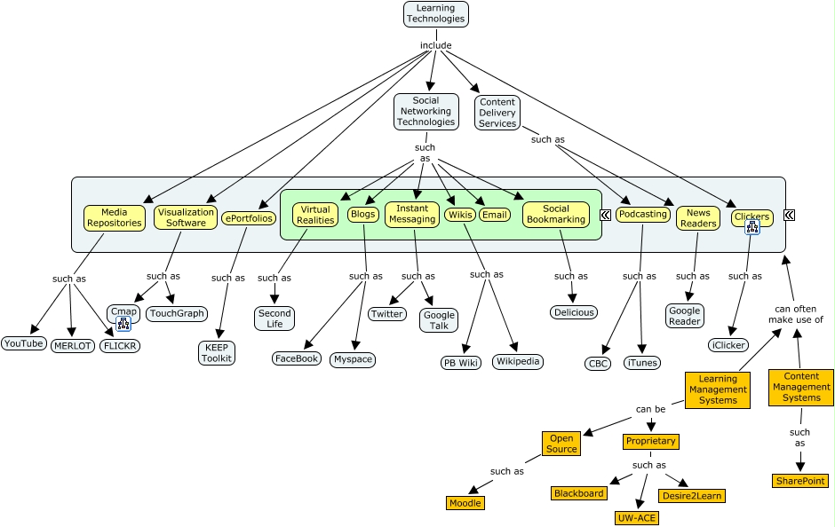 This Concept Map, created with IHMC CmapTools, has information related to: Learning Technologies, ePortfolios such as KEEP Toolkit, Podcasting such as iTunes, Learning Technologies include Social Networking Technologies, Social Networking Technologies such as Email, Learning Technologies include Media Repositories, Visualization Software such as Cmap, Social Networking Technologies such as Virtual Realities, News Readers such as Google Reader, Learning Technologies include Content Delivery Services, Content Management Systems can often make use of ????, Social Networking Technologies such as Instant Messaging, Content Delivery Services such as Podcasting, Proprietary such as Blackboard, Proprietary such as Desire2Learn, Visualization Software such as TouchGraph, Media Repositories such as YouTube, Media Repositories such as MERLOT, Learning Technologies include Clickers, Social Bookmarking such as Delicious, Clickers such as iClicker
