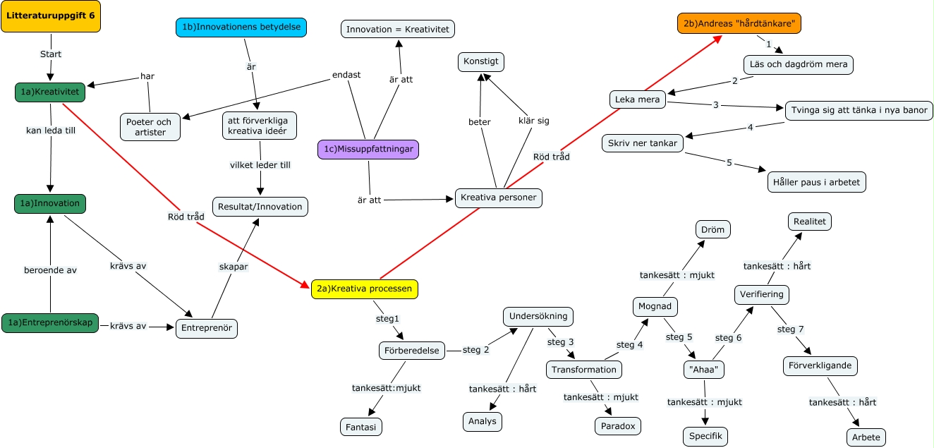 Den här kartan innehåller information om: Litteraturuppgift6, 1a)Innovation krävs av Entreprenör, 1b)Innovationens betydelse är att förverkliga kreativa ideér, Mognad tankesätt : mjukt Dröm, 1a)Kreativitet Röd tråd 2a)Kreativa processen, Leka mera 3 Tvinga sig att tänka i nya banor, Kreativa personer klär sig Konstigt, att förverkliga kreativa ideér vilket leder till Resultat/Innovation, Entreprenör skapar Resultat/Innovation, 1a)Entreprenörskap krävs av Entreprenör, 2b)Andreas "hårdtänkare" 1 Läs och dagdröm mera