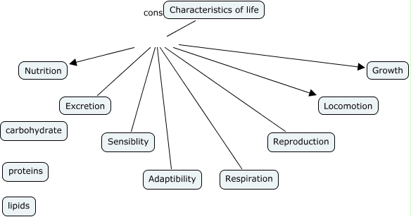 ZYs, Characteristics of life consist of Nutrition, Characteristics of life consist of Respiration, Characteristics of life consist of Reproduction, Characteristics of life consist of Growth, Characteristics of life consist of Adaptibility, Characteristics of life consist of Excretion, Characteristics of life consist of Sensiblity, Characteristics of life consist of Locomotion