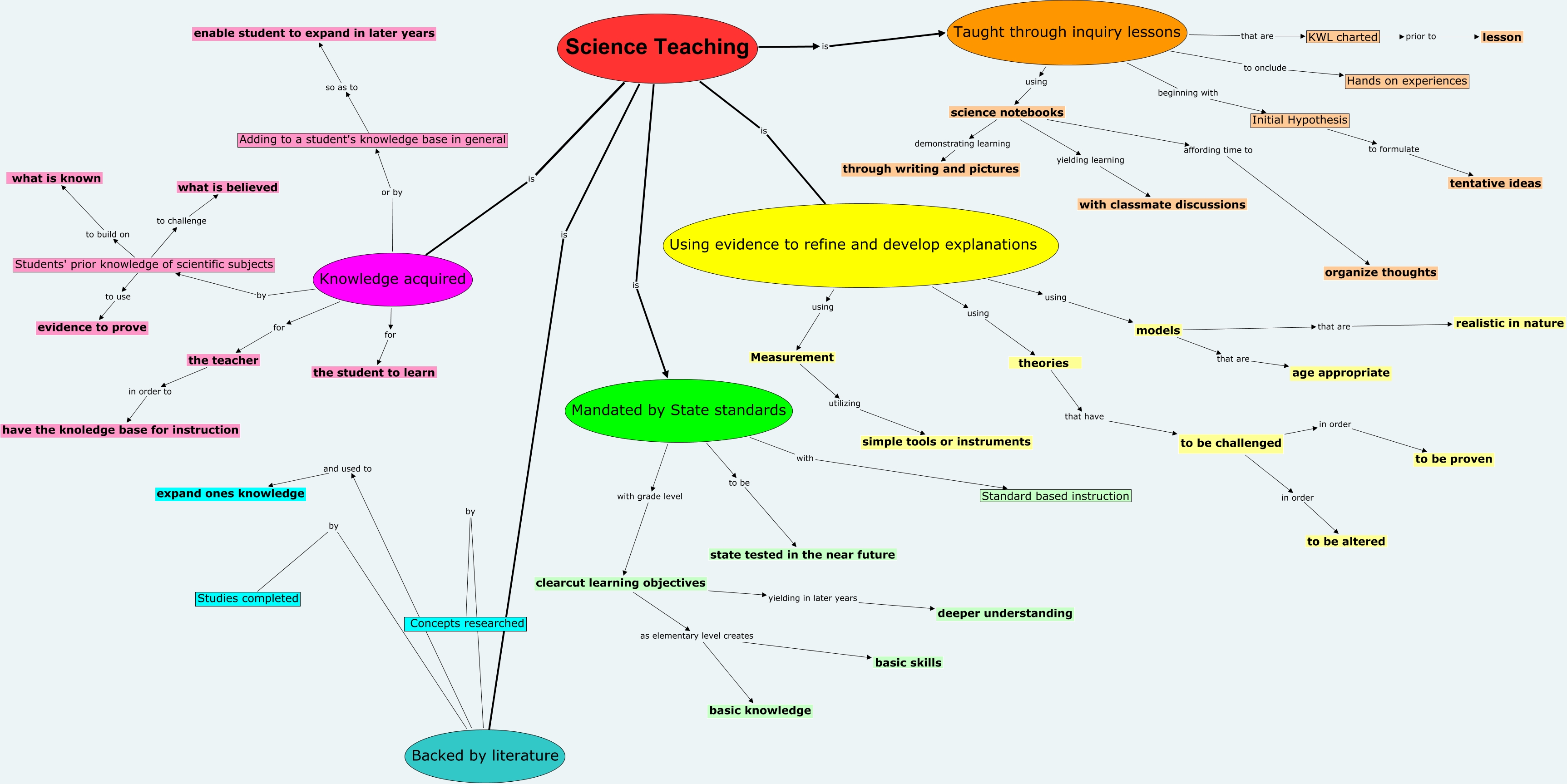 This Concept Map, created with IHMC CmapTools, has information related to: hays st2, Initial Hypothesis to formulate tentative ideas, Measurement utilizing simple tools or instruments, Backed by literature by Studies completed, Science Teaching is Knowledge acquired, KWL charted prior to lesson, to be challenged in order to be proven, Mandated by State standards with grade level clearcut learning objectives, Mandated by State standards with Standard based instruction, Science Teaching is Mandated by State standards, models that are age appropriate, Taught through inquiry lessons using science notebooks, Science Teaching is Using evidence to refine and develop explanations, Using evidence to refine and develop explanations using theories, Using evidence to refine and develop explanations using models, Backed by literature and used to expand ones knowledge, Mandated by State standards to be state tested in the near future, Using evidence to refine and develop explanations using Measurement, clearcut learning objectives as elementary level creates basic skills, Knowledge acquired for the teacher, Backed by literature by Concepts researched