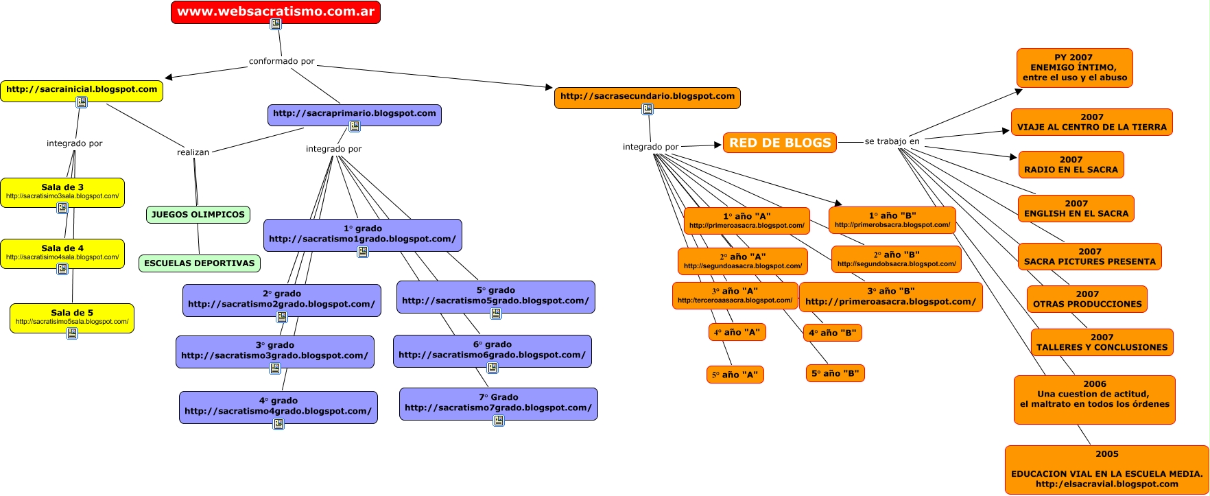websacaratiismo, http://sacrasecundario.blogspot.com integrado por 5° año "B", RED DE BLOGS se trabajo en 2007 VIAJE AL CENTRO DE LA TIERRA, http://sacrainicial.blogspot.com integrado por Sala de 4 http://sacratisimo4sala.blogspot.com/, RED DE BLOGS se trabajo en PY 2007 ENEMIGO ÍNTIMO, entre el uso y el abuso, http://sacraprimario.blogspot.com realizan JUEGOS OLIMPICOS, http://sacraprimario.blogspot.com integrado por 3° grado http://sacratismo3grado.blogspot.com/, http://sacraprimario.blogspot.com integrado por 2° grado http://sacratismo2grado.blogspot.com/, http://sacrasecundario.blogspot.com integrado por 1° año "B" http://primerobsacra.blogspot.com/, RED DE BLOGS se trabajo en 2005 EDUCACION VIAL EN LA ESCUELA MEDIA. http:/elsacravial.blogspot.com, http://sacrainicial.blogspot.com integrado por Sala de 3 http://sacratisimo3sala.blogspot.com/