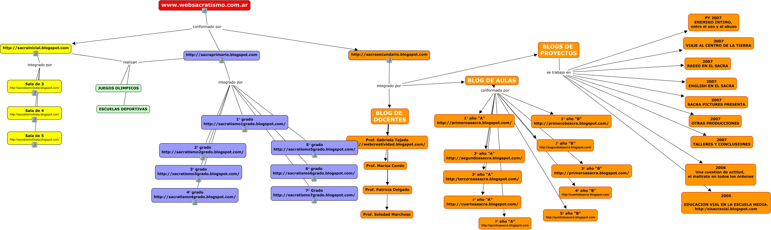 websacratisimo, http://sacraprimario.blogspot.com realizan ESCUELAS DEPORTIVAS, http://sacraprimario.blogspot.com integrado por 2° grado http://sacratismo2grado.blogspot.com/, http://sacrainicial.blogspot.com realizan ESCUELAS DEPORTIVAS, http://sacrasecundario.blogspot.com integrado por 5° año "A" http://quintoasacra.blogspot.com, BLOGS DE PROYECTOS se trabajo en 2007 OTRAS PRODUCCIONES, BLOG DE AULAS conformado por 2° año "B" http://segundobsacra.blogspot.com/, BLOGS DE PROYECTOS se trabajo en 2007 SACRA PICTURES PRESENTA, BLOG DE DOCENTES ???? Prof. Gabriela Tejada http://webcreatividad.blogspot.com/, http://sacrasecundario.blogspot.com integrado por 3° año "B" http://primeroasacra.blogspot.com/, http://sacraprimario.blogspot.com integrado por 4° grado http://sacratismo4grado.blogspot.com/