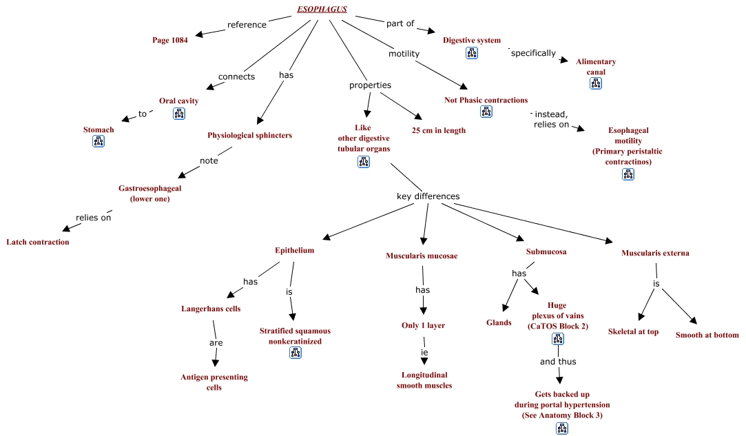 This Concept Map has information related to: 16. Esophagus, Only 1 layer ie Longitudinal smooth muscles, ESOPHAGUS connects Oral cavity, ESOPHAGUS reference Page 1084, Epithelium has Langerhans cells, Huge plexus of vains (CaTOS Block 2) and thus Gets backed up during portal hypertension (See Anatomy Block 3), ESOPHAGUS part of Digestive system, ESOPHAGUS motility Not Phasic contractions, Like other digestive tubular organs key differences Submucosa, Like other digestive tubular organs key differences Muscularis externa, Digestive system specifically Alimentary canal