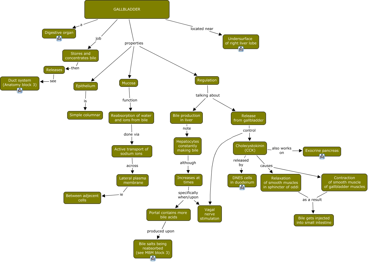 This Concept Map has information related to: 23. Gallbladder, Portal contains more bile acids produced upon Bile salts being reabsorbed (see MBM block 3), Cholecystokinin (CCK) causes Relaxation of smooth muscles in sphincter of oddi, Increases at times specifically when/upon Portal contains more bile acids, Cholecystokinin (CCK) released by DNES cells in duodenum, Relaxation of smooth muscles in sphincter of oddi as a result Bile gets injected into small intestine, Releases see Duct system (Anatomy block 3), Release from gallbladder control Vagal nerve stimulaton, Hepatocytes constantly making bile although Increases at times, GALLBLADDER a Digestive organ, Increases at times specifically when/upon Vagal nerve stimulaton