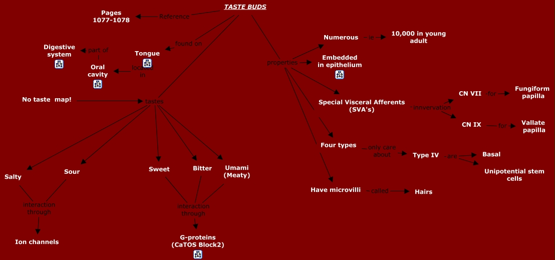This Concept Map has information related to: 15b-1. Taste Buds, TASTE BUDS Reference Pages 1077-1078, No taste map! tastes Sour, TASTE BUDS properties Embedded in epithelium, TASTE BUDS properties Four types, TASTE BUDS properties Have microvilli, Umami (Meaty) interaction through G-proteins (CaTOS Block2), Numerous ie 10,000 in young adult, No taste map! tastes Bitter, Salty interaction through Ion channels, Oral cavity part of Digestive system
