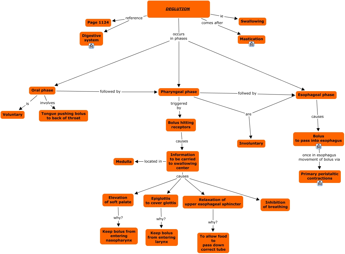 This Concept Map has information related to: 25. Deglutition, DEGLUTION occurs in phases Oral phase, Information to be carried to swallowing center causes Relaxation of upper esophageal sphincter, DEGLUTION comes after Mastication, DEGLUTION reference Page 1124, Information to be carried to swallowing center causes Epiglottis to cover glottis, DEGLUTION occurs in phases Pharyngeal phase, Epiglottis to cover glottis why? Keep bolus from entering larynx, Pharyngeal phase triggered by Bolus hitting receptors, Information to be carried to swallowing center causes Elevation of soft palate, Pharyngeal phase are Involuntary