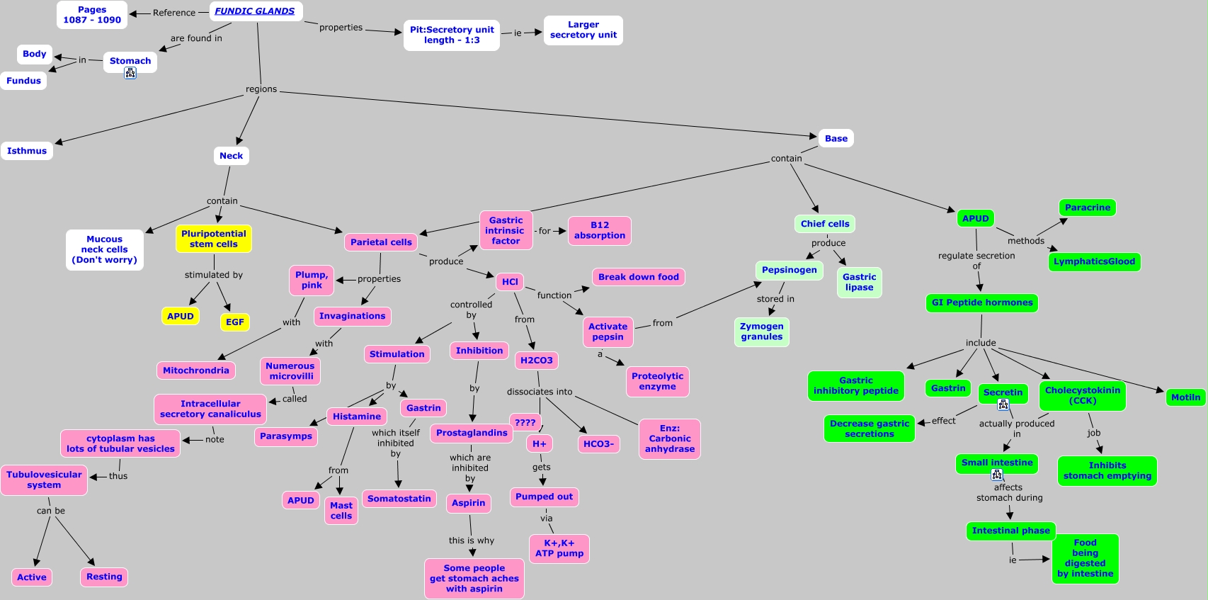 This Concept Map has information related to: 17a. Fundic Glands, Stomach in Body, Invaginations with Numerous microvilli, GI Peptide hormones include Gastrin, Cholecystokinin (CCK) job Inhibits stomach emptying, GI Peptide hormones include Secretin, GI Peptide hormones include Motiln, Pumped out via K+,K+ ATP pump, Chief cells produce Pepsinogen, Stomach in Fundus, Secretin actually produced in Small intestine