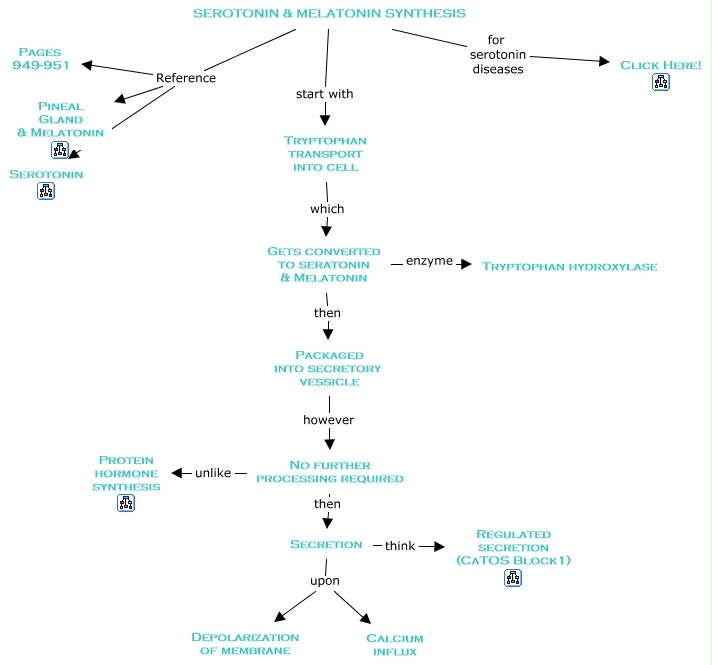 This Concept Map has information related to: 10b. Serotonin & Melatonin Synthesis, Secretion upon Depolarization of membrane, Tryptophan transport into cell which Gets converted to seratonin & Melatonin, Secretion upon Calcium influx, Gets converted to seratonin & Melatonin then Packaged into secretory vessicle, Secretion think Regulated secretion (CaTOS Block1), Packaged into secretory vessicle however No further processing required, SEROTONIN & MELATONIN SYNTHESIS start with Tryptophan transport into cell, SEROTONIN & MELATONIN SYNTHESIS Reference Pages 949-951, SEROTONIN & MELATONIN SYNTHESIS for serotonin diseases Click Here!, SEROTONIN & MELATONIN SYNTHESIS Reference Serotonin