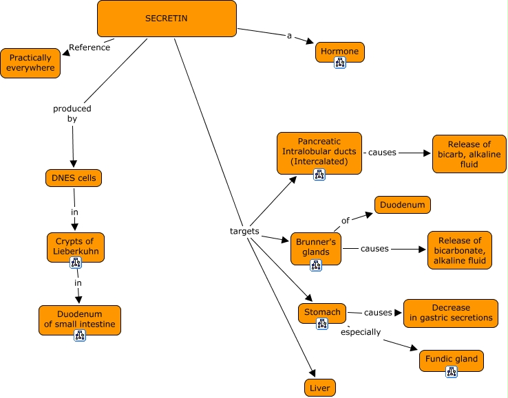 This Concept Map has information related to: 21. Secretin, Stomach especially Fundic gland, SECRETIN targets Stomach, SECRETIN targets Liver, DNES cells in Crypts of Lieberkuhn, Pancreatic Intralobular ducts (Intercalated) causes Release of bicarb, alkaline fluid, SECRETIN Reference Practically everywhere, Crypts of Lieberkuhn in Duodenum of small intestine, SECRETIN targets Pancreatic Intralobular ducts (Intercalated), SECRETIN a Hormone, Brunner's glands of Duodenum
