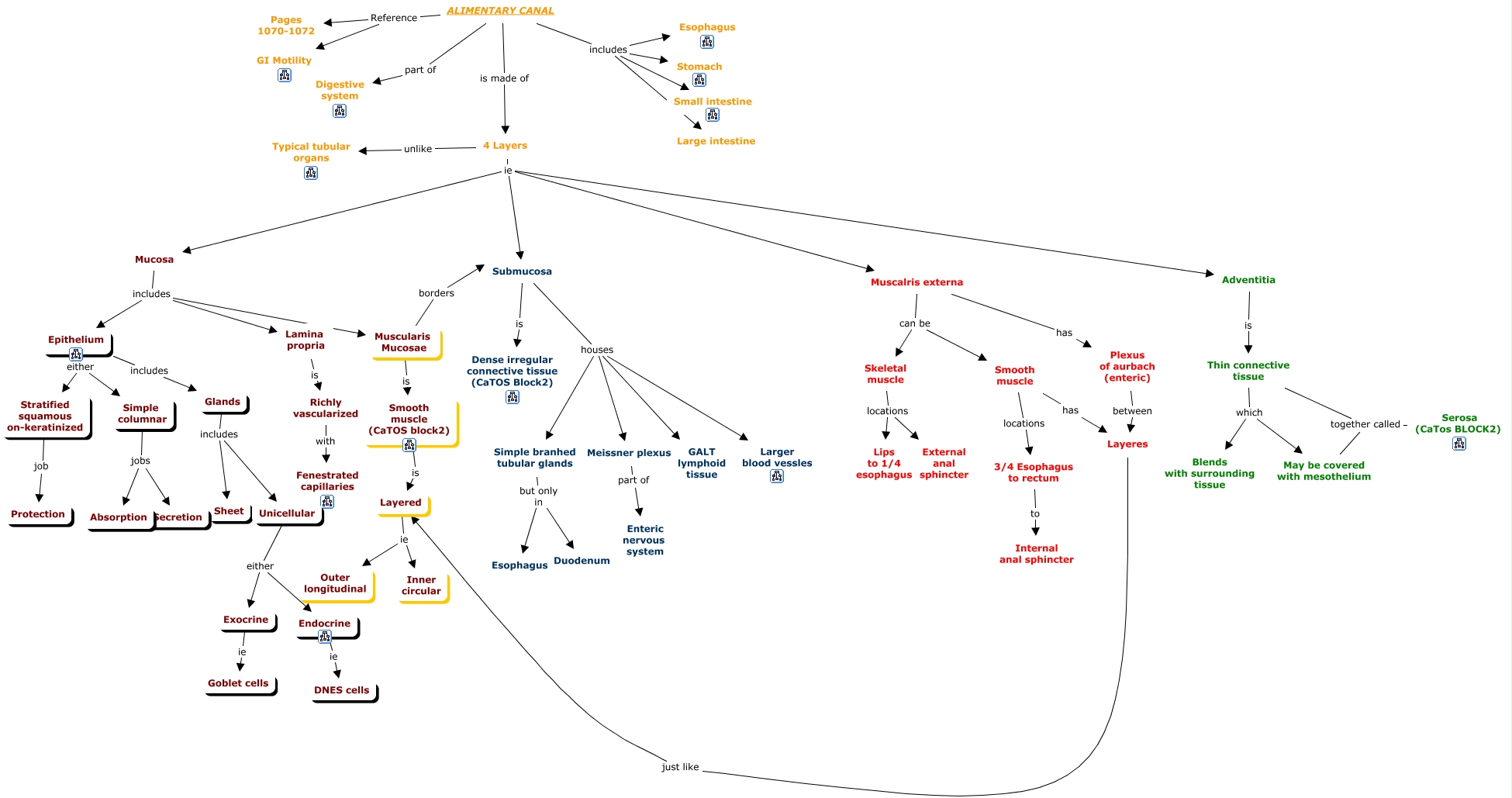 This Concept Map has information related to: 14a. Alimentary Canal, Submucosa is Dense irregular connective tissue (CaTOS Block2), Submucosa houses Meissner plexus, Richly vascularized with Fenestrated capillaries, Simple columnar jobs Absorption, Muscalris externa has Plexus of aurbach (enteric), Mucosa includes Lamina propria, Skeletal muscle locations External anal sphincter, Plexus of aurbach (enteric) between Layeres, Layered ie Inner circular, Exocrine ie Goblet cells