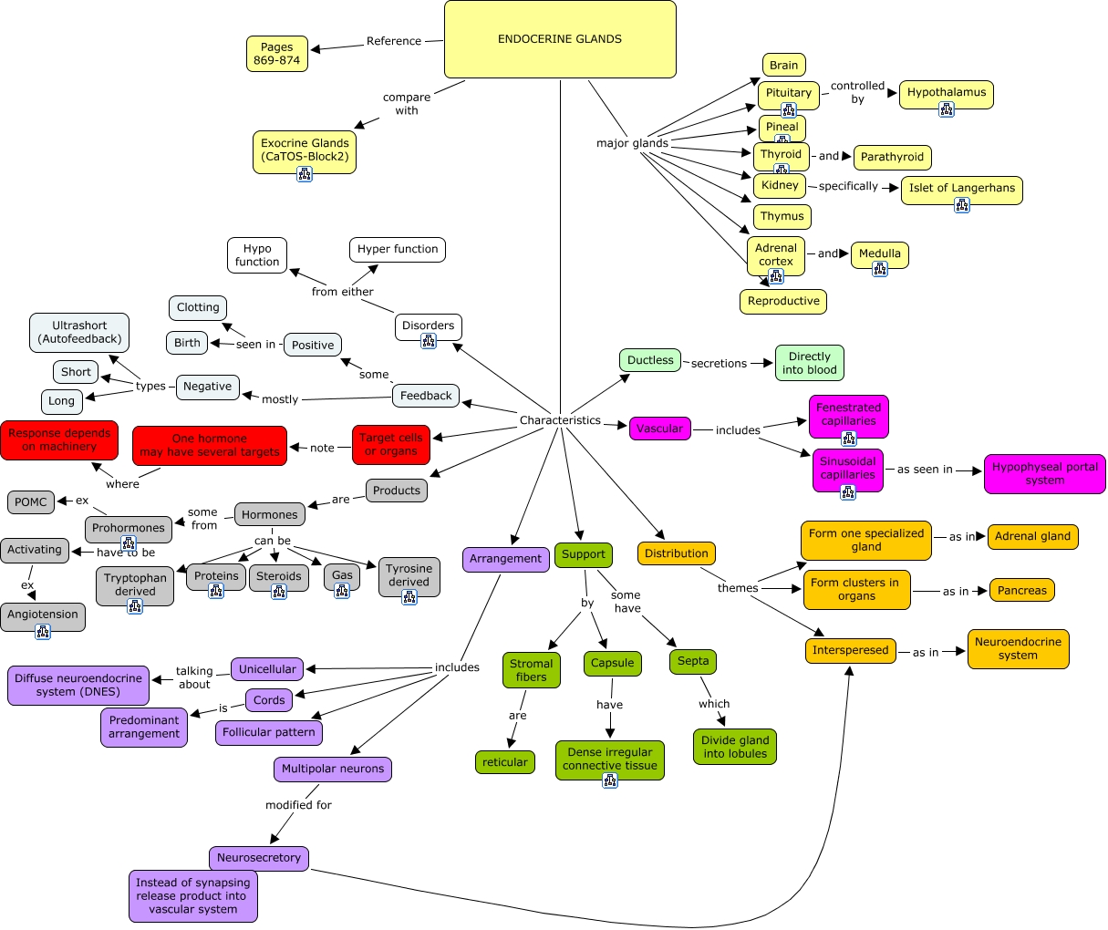 This Concept Map has information related to: 01. Overview of Endocrine Glands, Support by Stromal fibers, Negative types Long, ENDOCERINE GLANDS major glands Pituitary, ENDOCERINE GLANDS Characteristics Distribution, Neurosecretory Intersperesed, Arrangement includes Multipolar neurons, ENDOCERINE GLANDS Reference Pages 869-874, ENDOCERINE GLANDS Characteristics Feedback, Prohormones have to be Activating, Activating ex Angiotension