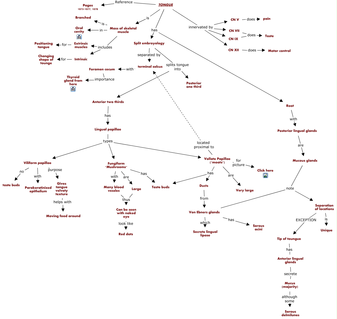 This Concept Map has information related to: 15b. Tongue, Many blood vessles thus Can be seen with naked eye, Separation of locations EXCEPTION Tip of toungue, Root with Posterior lingual glands, Fungiform "Mushrooms" are Large, CN VII does Taste, Viliform papillae purpose Gives tongue velvety texture, CN XII does Motor control, Lingual papillae types Viliform papillae, Large thus Can be seen with naked eye, Vallate Papillae ("moats") has Taste buds