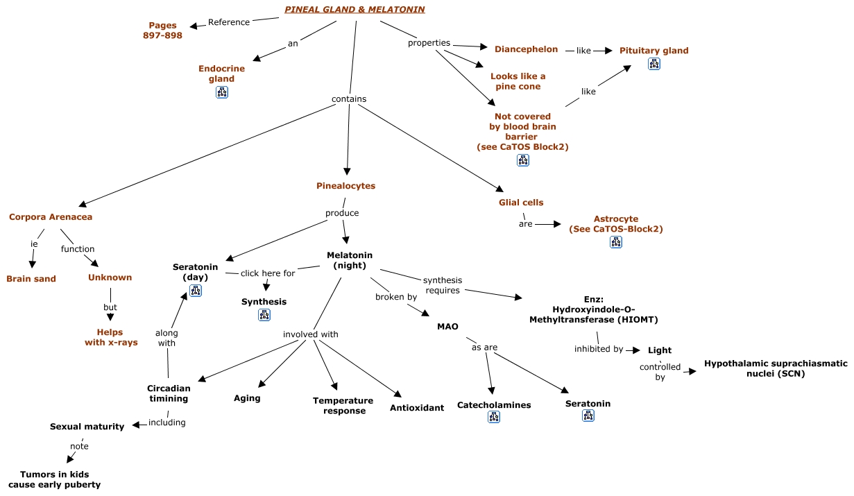 This Concept Map has information related to: 10. Pineal Gland & Melatonin, Melatonin (night) involved with Aging, PINEAL GLAND & MELATONIN contains Pinealocytes, Pinealocytes produce Melatonin (night), MAO as are Catecholamines, Melatonin (night) broken by MAO, Melatonin (night) involved with Antioxidant, Seratonin (day) click here for Synthesis, Enz: Hydroxyindole-O- Methyltransferase (HIOMT) inhibited by Light, PINEAL GLAND & MELATONIN properties Diancephelon, Circadian timining including Sexual maturity