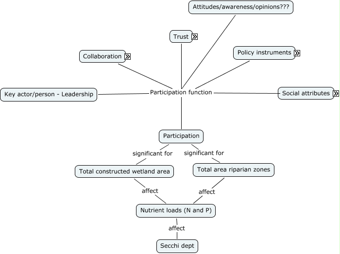 Den här kartan innehåller information om: Participation map, Social attributes Participation function Participation, Key actor/person - Leadership Participation function Participation, Nutrient loads (N and P) affect Secchi dept, Policy instruments Participation function Participation, Trust Participation function Participation, Total constructed wetland area affect Nutrient loads (N and P), Participation significant for Total area riparian zones, Collaboration Participation function Participation, Total area riparian zones affect Nutrient loads (N and P), Participation significant for Total constructed wetland area, Attitudes/awareness/opinions??? Participation function Participation
