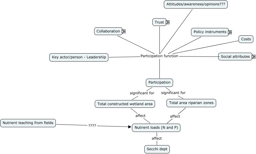 Den här kartan innehåller information om: Participation map_b, Social attributes Participation function Participation, Policy instruments Participation function Participation, Nutrient loads (N and P) affect Secchi dept, Key actor/person - Leadership Participation function Participation, Trust Participation function Participation, Nutrient leaching from fields ???? Nutrient loads (N and P), Total constructed wetland area affect Nutrient loads (N and P), Collaboration Participation function Participation, Participation significant for Total area riparian zones, Total area riparian zones affect Nutrient loads (N and P), Costs Participation function Participation, Attitudes/awareness/opinions??? Participation function Participation, Participation significant for Total constructed wetland area