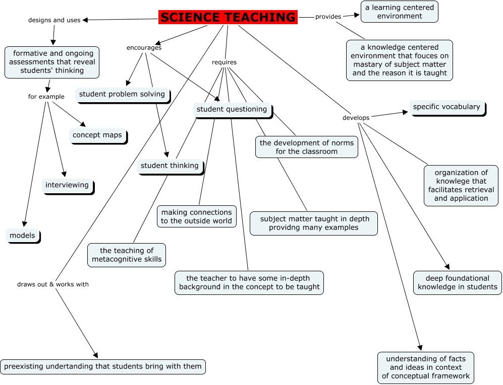 This Concept Map, created with IHMC CmapTools, has information related to: Dixon st 2, SCIENCE TEACHING encourages student thinking, SCIENCE TEACHING develops understanding of facts and ideas in context of conceptual framework, SCIENCE TEACHING designs and uses formative and ongoing assessments that reveal students' thinking, SCIENCE TEACHING encourages student questioning, SCIENCE TEACHING provides a learning centered environment, SCIENCE TEACHING encourages student problem solving, formative and ongoing assessments that reveal students' thinking for example interviewing, SCIENCE TEACHING requires the teaching of metacognitive skills, SCIENCE TEACHING develops deep foundational knowledge in students, SCIENCE TEACHING provides a knowledge centered environment that fouces on mastary of subject matter and the reason it is taught, SCIENCE TEACHING draws out & works with preexisting undertanding that students bring with them, SCIENCE TEACHING requires subject matter taught in depth providng many examples, SCIENCE TEACHING requires the teacher to have some in-depth background in the concept to be taught, SCIENCE TEACHING develops specific vocabulary, SCIENCE TEACHING requires the development of norms for the classroom, SCIENCE TEACHING requires making connections to the outside world, formative and ongoing assessments that reveal students' thinking for example concept maps, formative and ongoing assessments that reveal students' thinking for example models, SCIENCE TEACHING develops organization of knowlege that facilitates retrieval and application